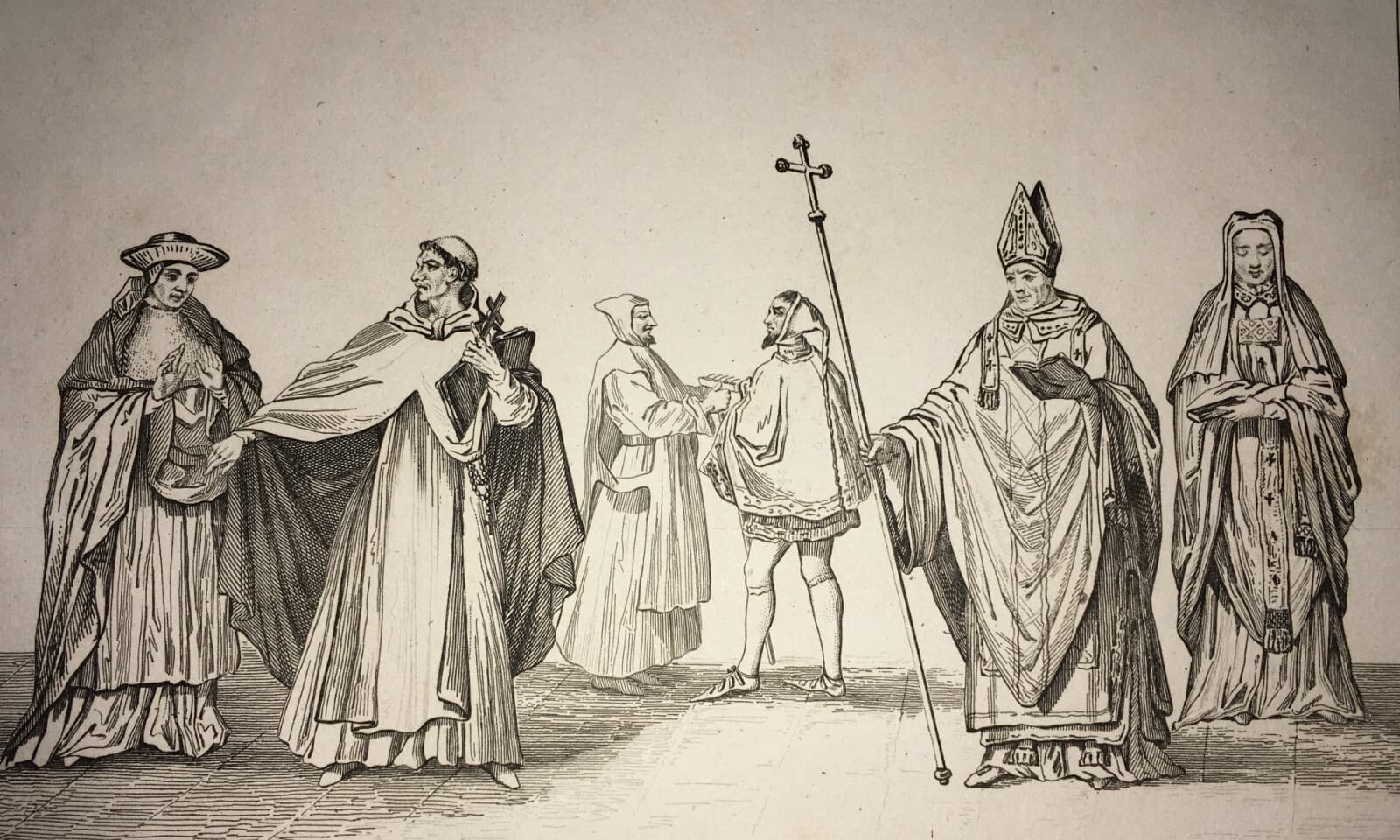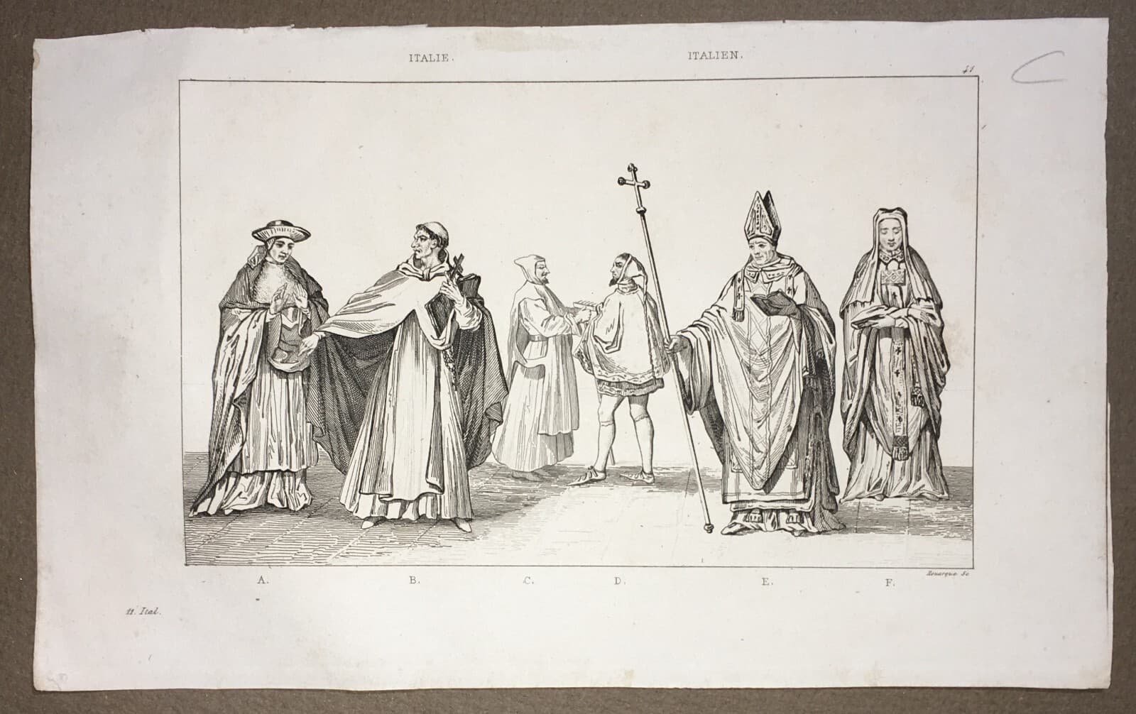 Costumi Italiani: Religiosi, Frate, Vescovo. Antica Incisione Rouargue, XIX Secolo