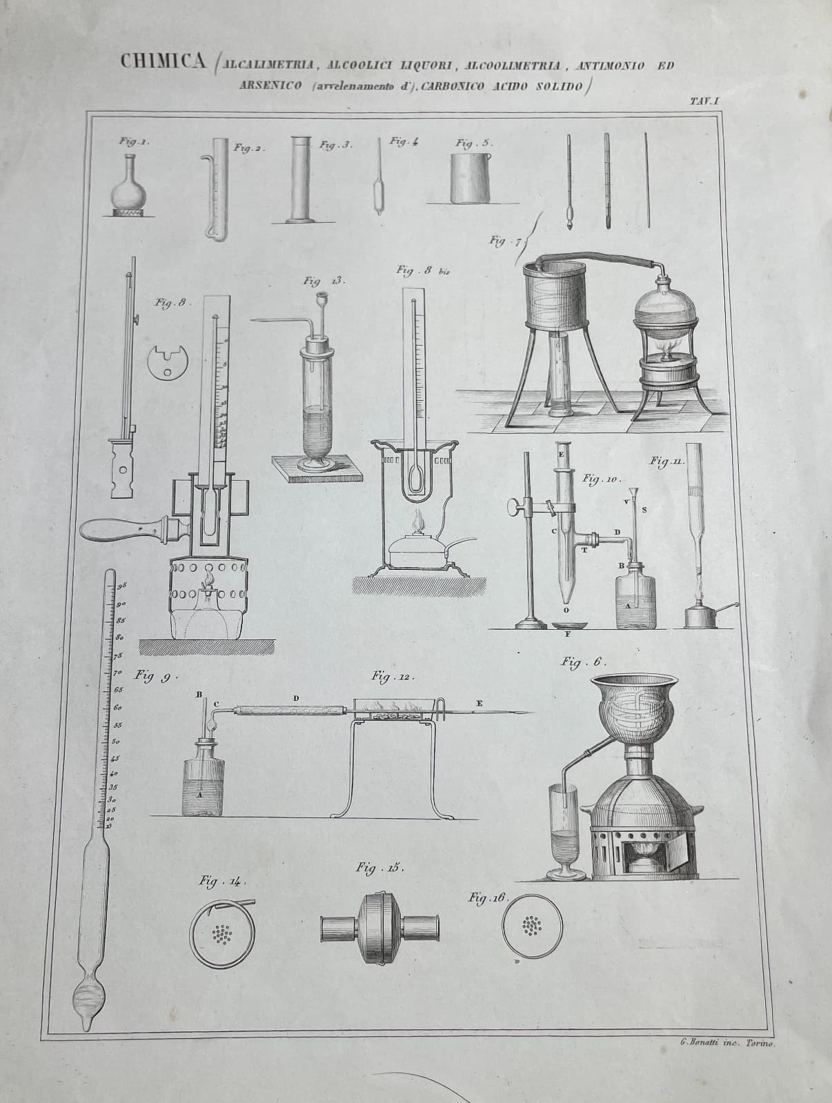 Chimica: Alcalimetria, Liquori, Alcoolimetria, Antimonio. Antica Stampa Di Bonatti