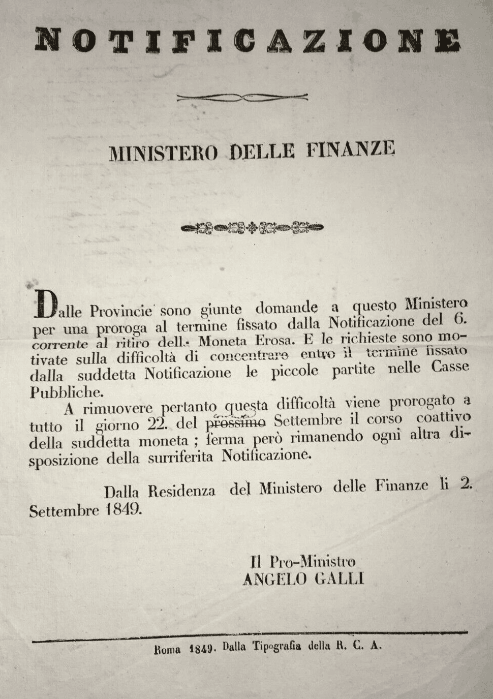 Numismatica: Moneta Erosa, Antico Foglio Volante Di Angelo Galli, Roma, 1849