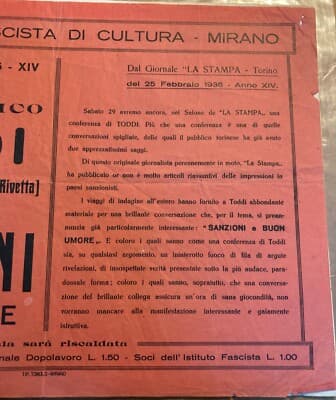 Toddi (Pietro Silvio Rivetta): Conferenza A Mirano. Antico Foglio Volante Pubblicitario Toniolo