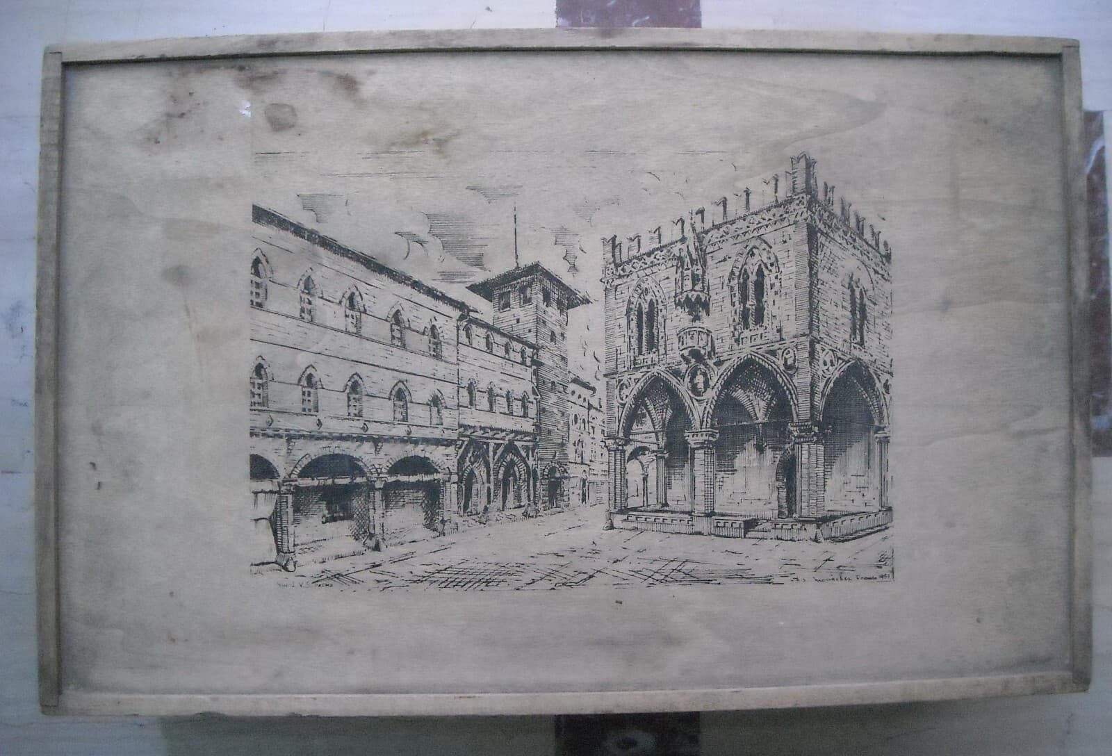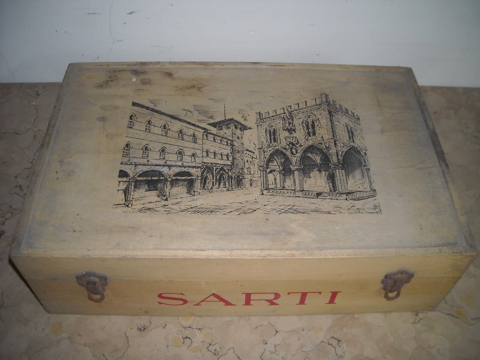 Distilleria Liquori Sarti: Scatola Figurata Con Veduta Di Città Pubblicitaria