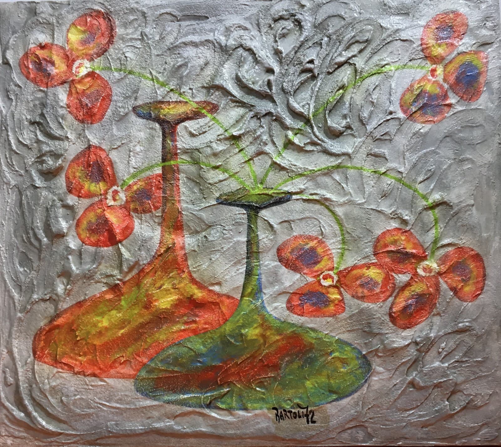 Arte: Piacevole Opera d'Arte, Soggetto Floreale Con Vasi O Bottiglie, Bartoli, 1972