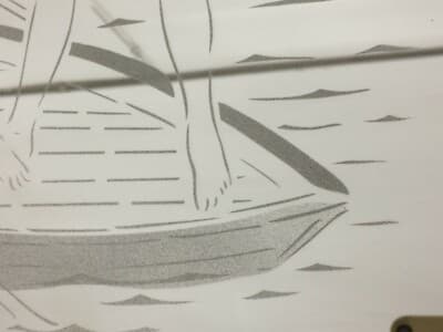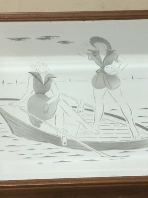 Vetri Decorativi E Modernariato: Specchio Inciso Con Coppia Di Giovani Donne In Barca