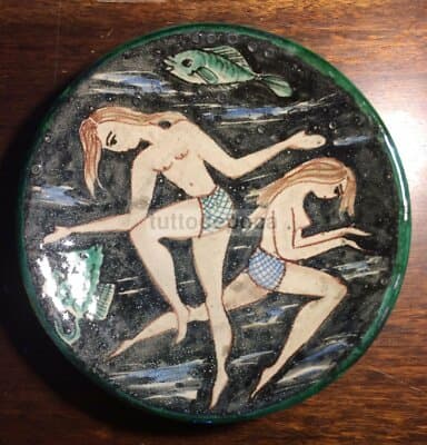 Arte Ceramica: Scena Con Bagnanti E Pesci, Mare, Vietri, Avallone, d'Epoca
