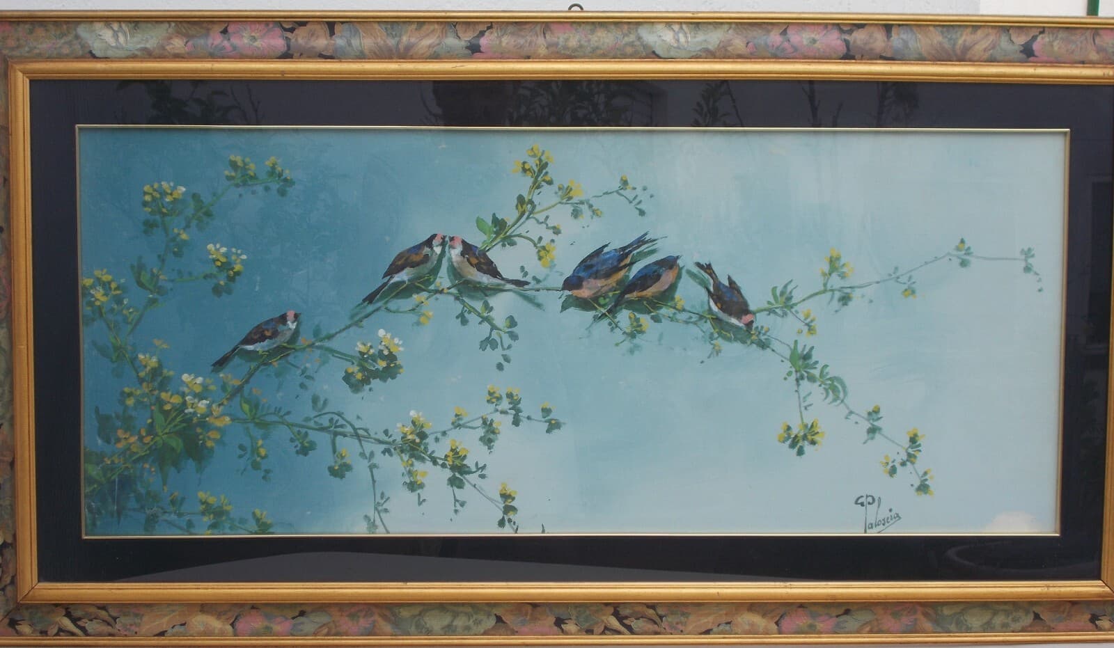 Gaetano Paloscia, Tralci Floreali Con Uccellini, Dipinto A Tempera