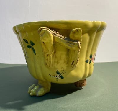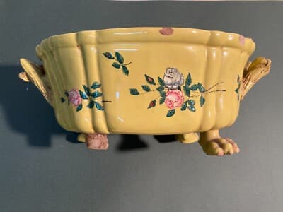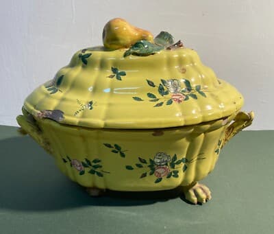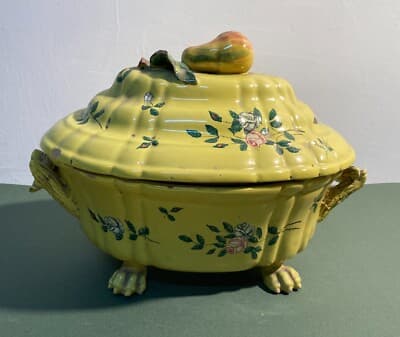 Antica Zuppiera In Ceramica Con Decoro Floreale, Pomolo A Pera E Piedi Leonini