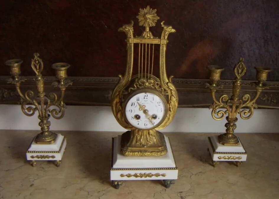 Trittico Decorativo Mazzarella: Orologio A Lira E Coppia Di Candelabri In Marmo E Metallo Dorato