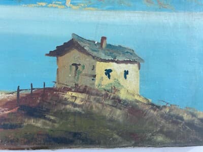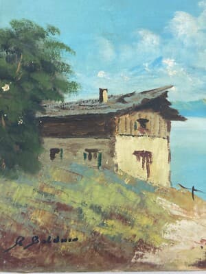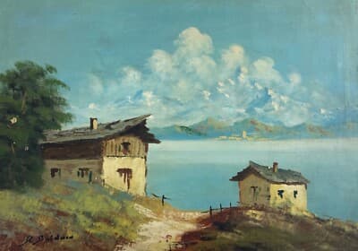 Dipinto d'Epoca: Paesaggio Montano Lacustre Con Baite Firmato