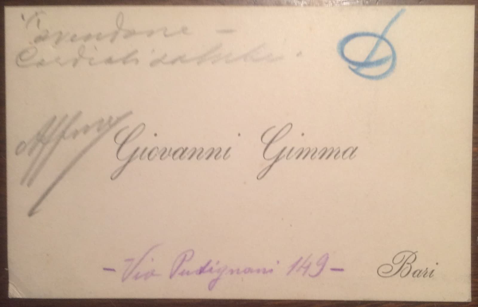Antico Biglietto Da Visita Da Collezione, Puglia, Bari, Giovanni Gimma, Con Missiva