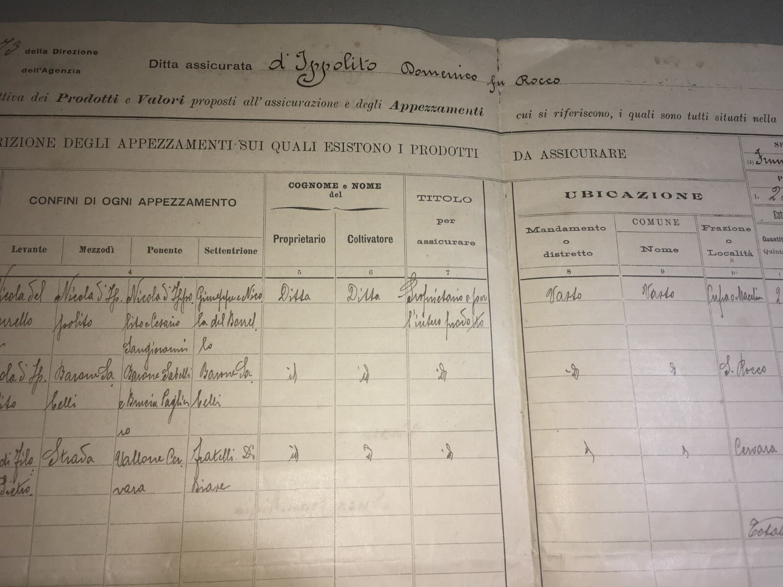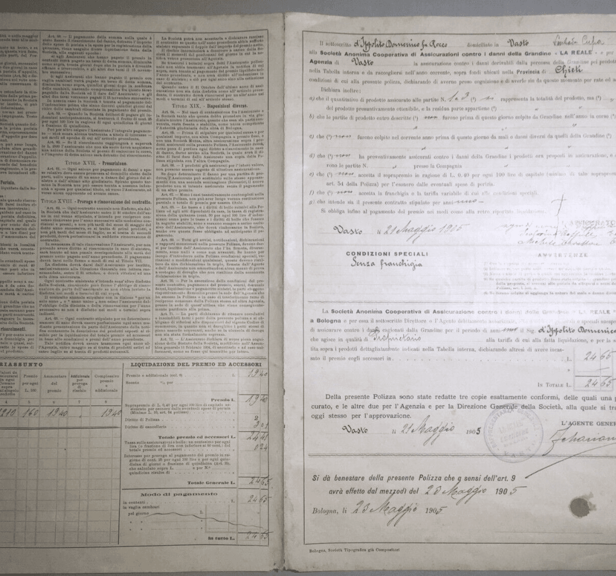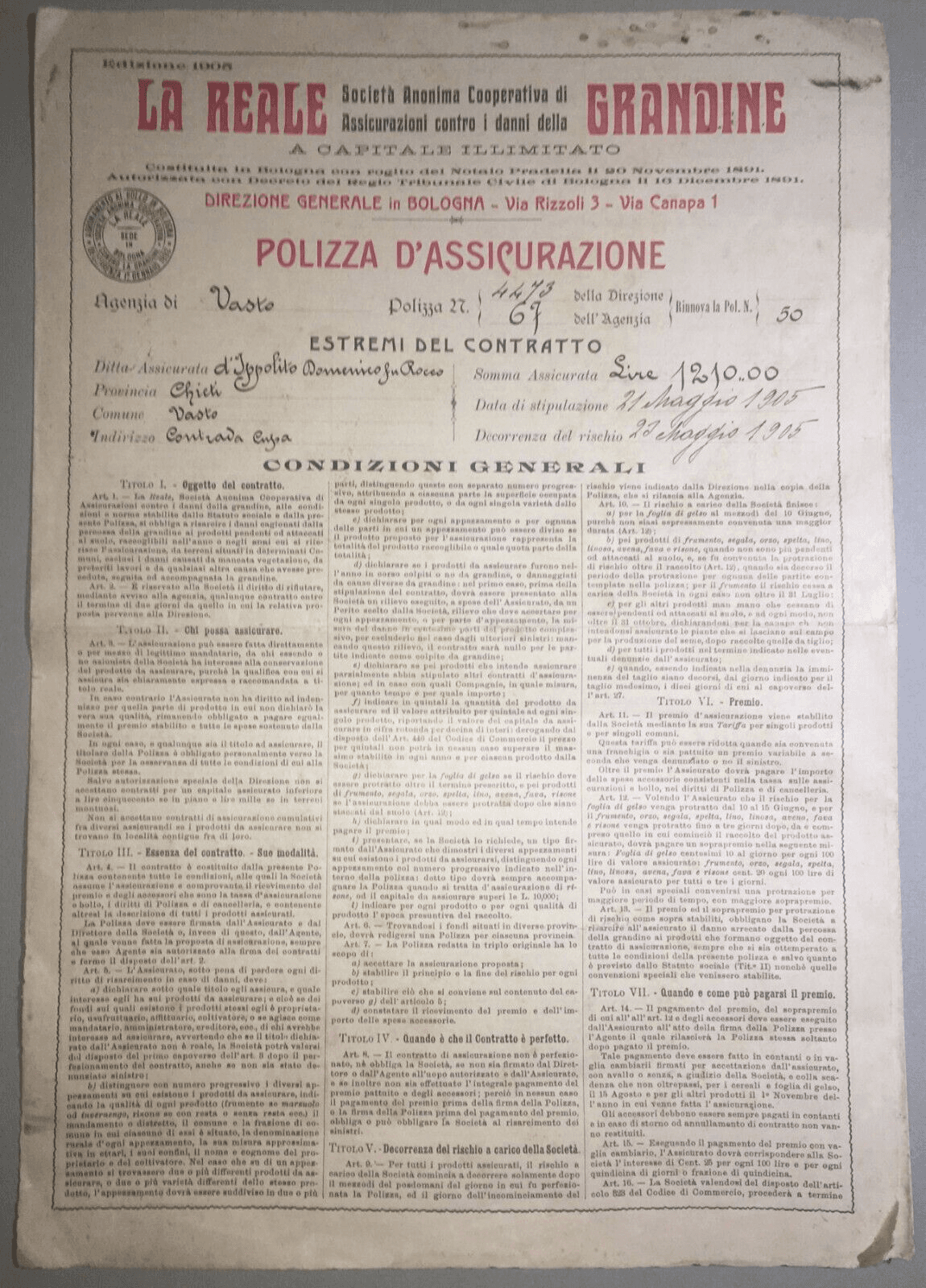 Polizza Di Assicurazione Agraria Reale Grandine, Vasto (Abruzzo), 1905