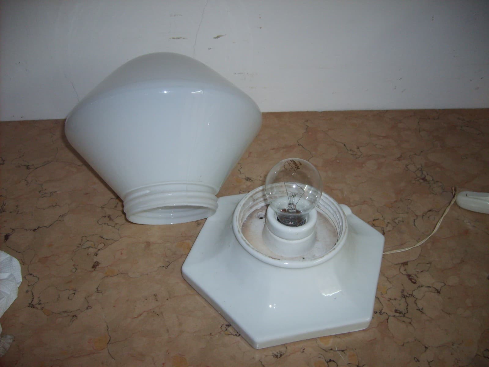 Lampada Da Tavolo Art Deco In Porcellana E Vetro Opalescente