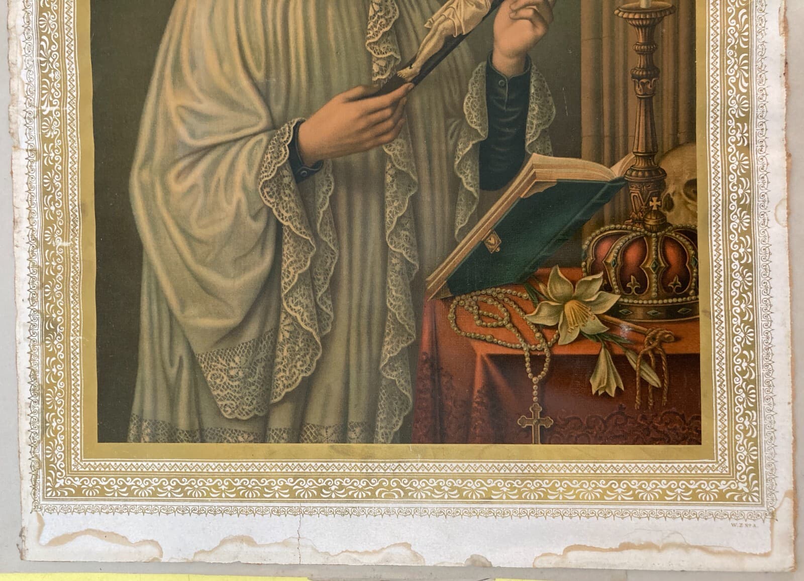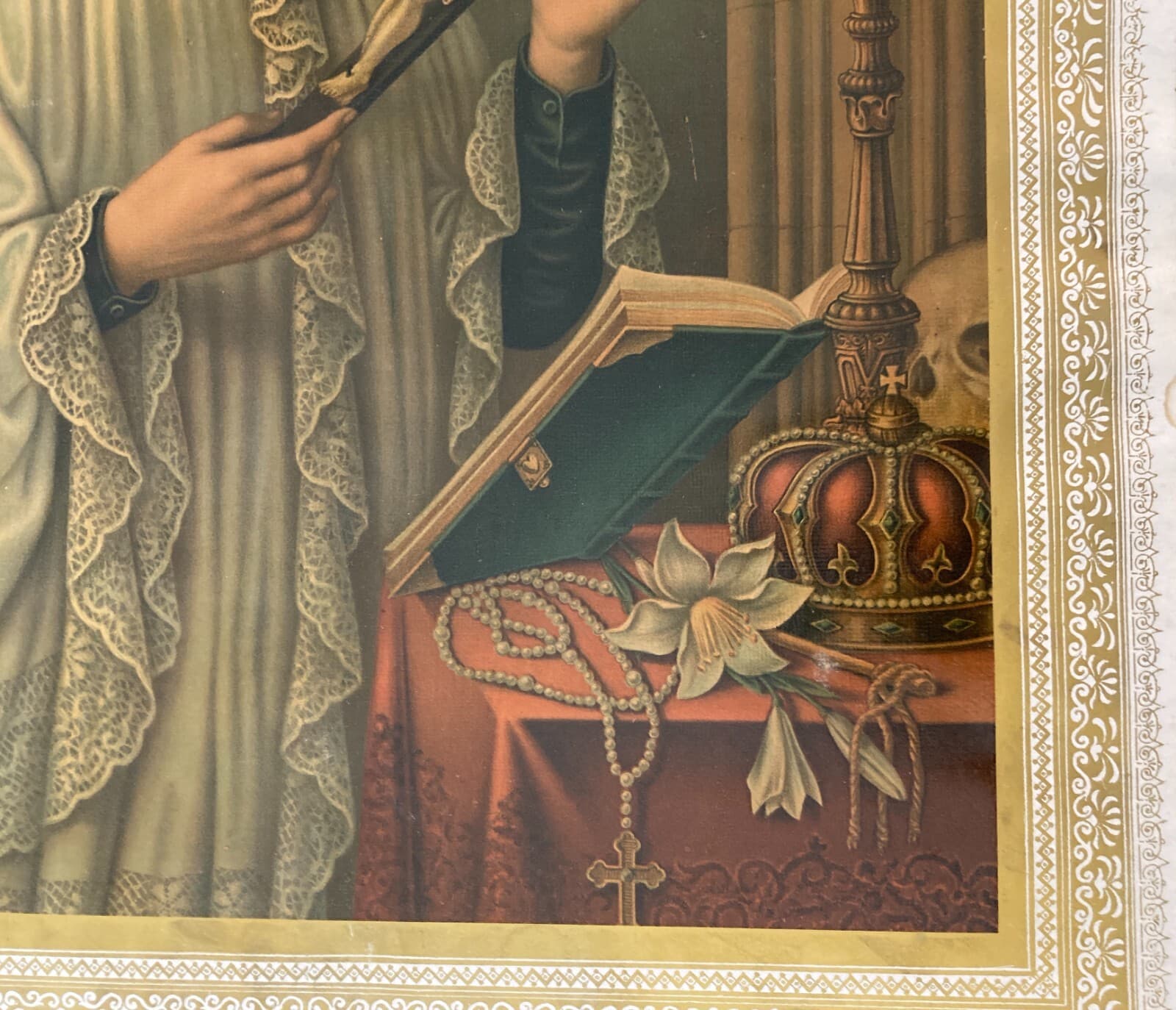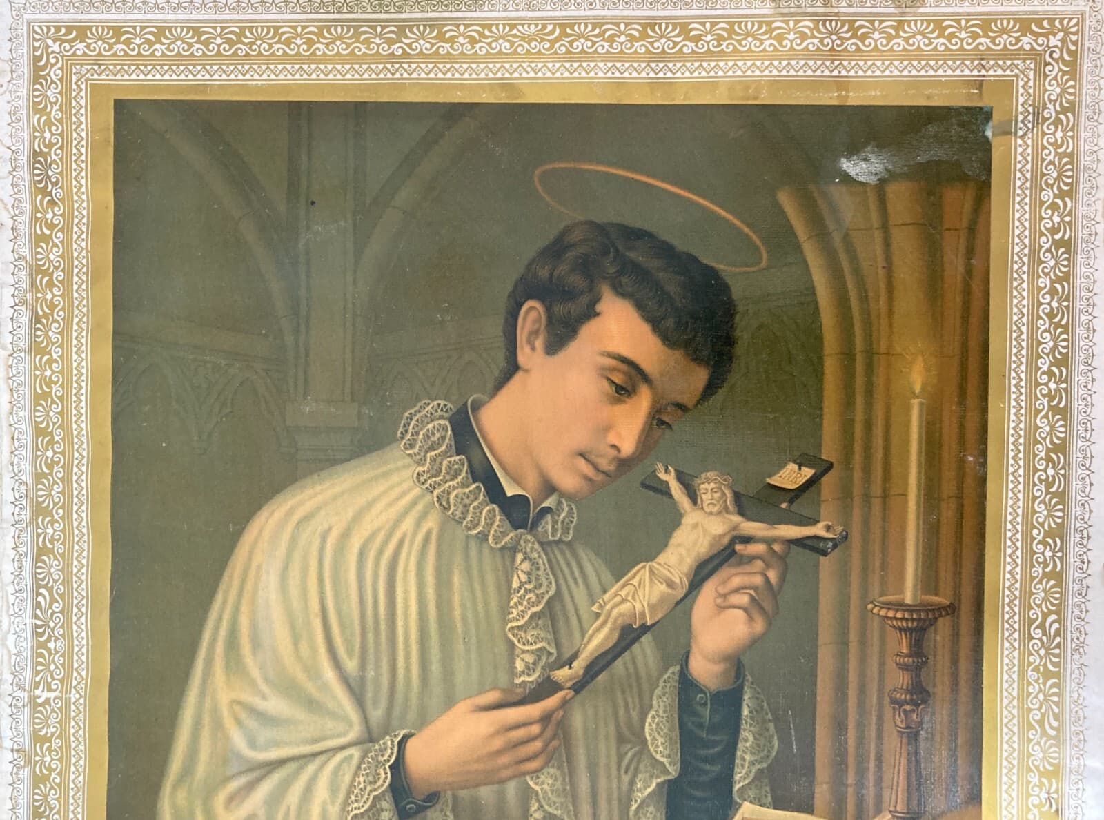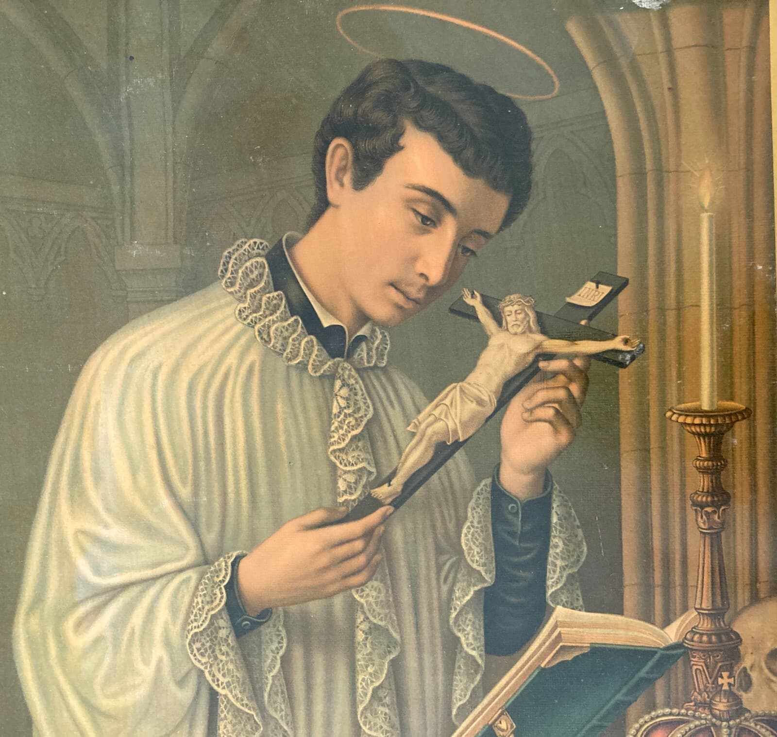 Antica Stampa Devozionale San Luigi Gonzaga Simboli Iconografici