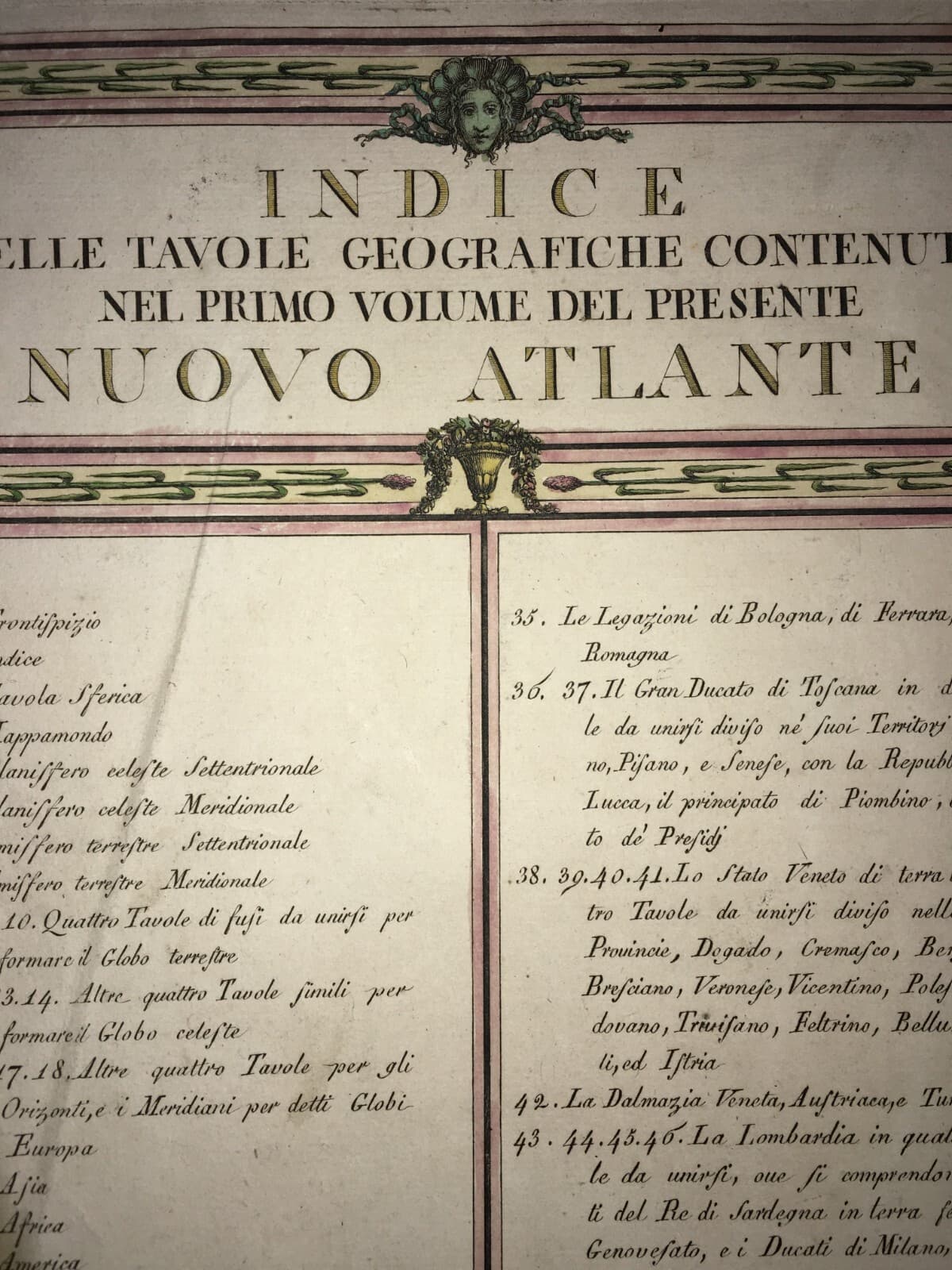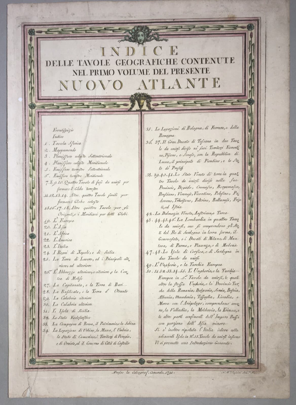 Atlante Geografico Del '700, Antica Tavola Dell'Indice, Incisione Colorata, Cassini