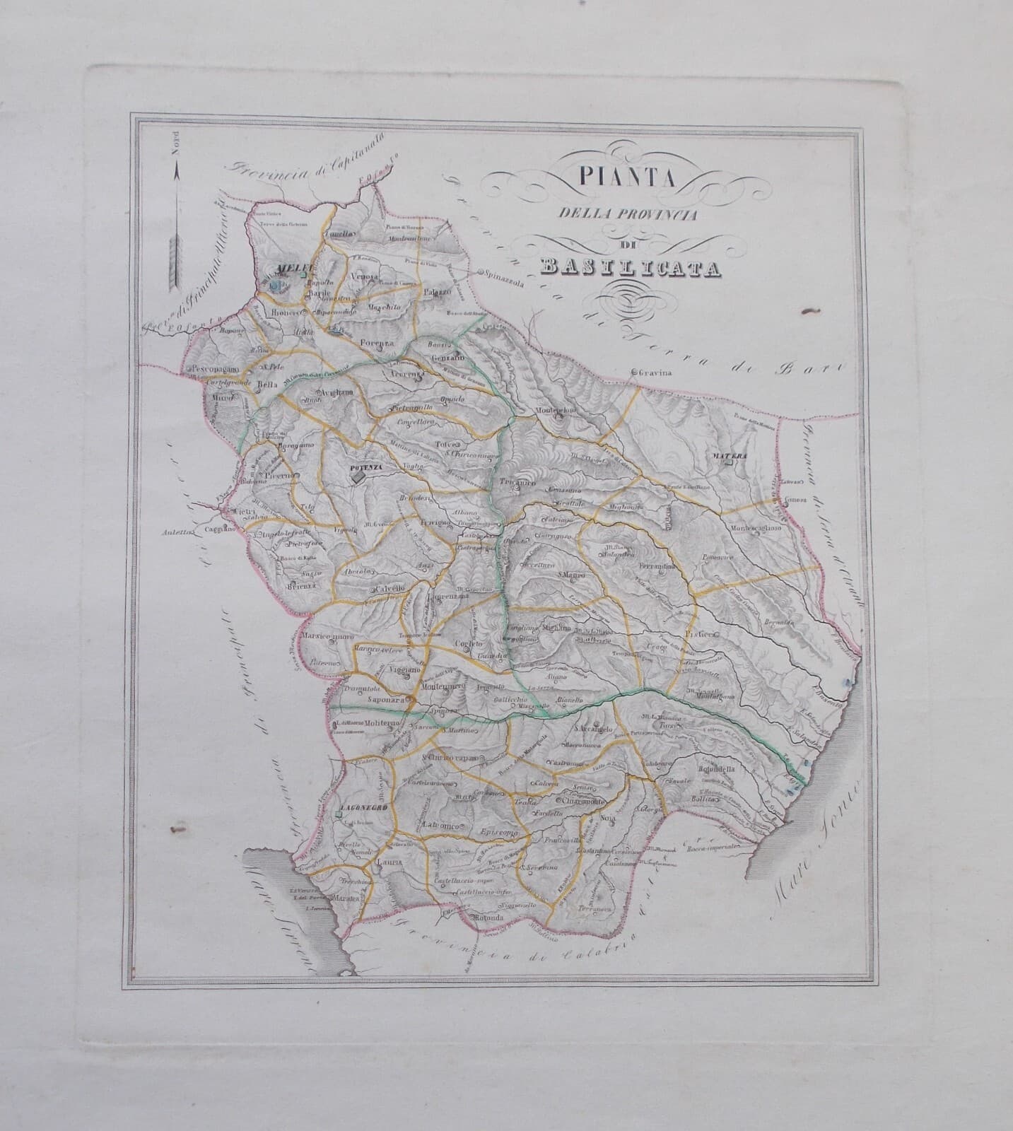 Antica Cartografia: Basilicata, Lucania, Potenza, Matera. Mappa Geografica Di De Sanctis.