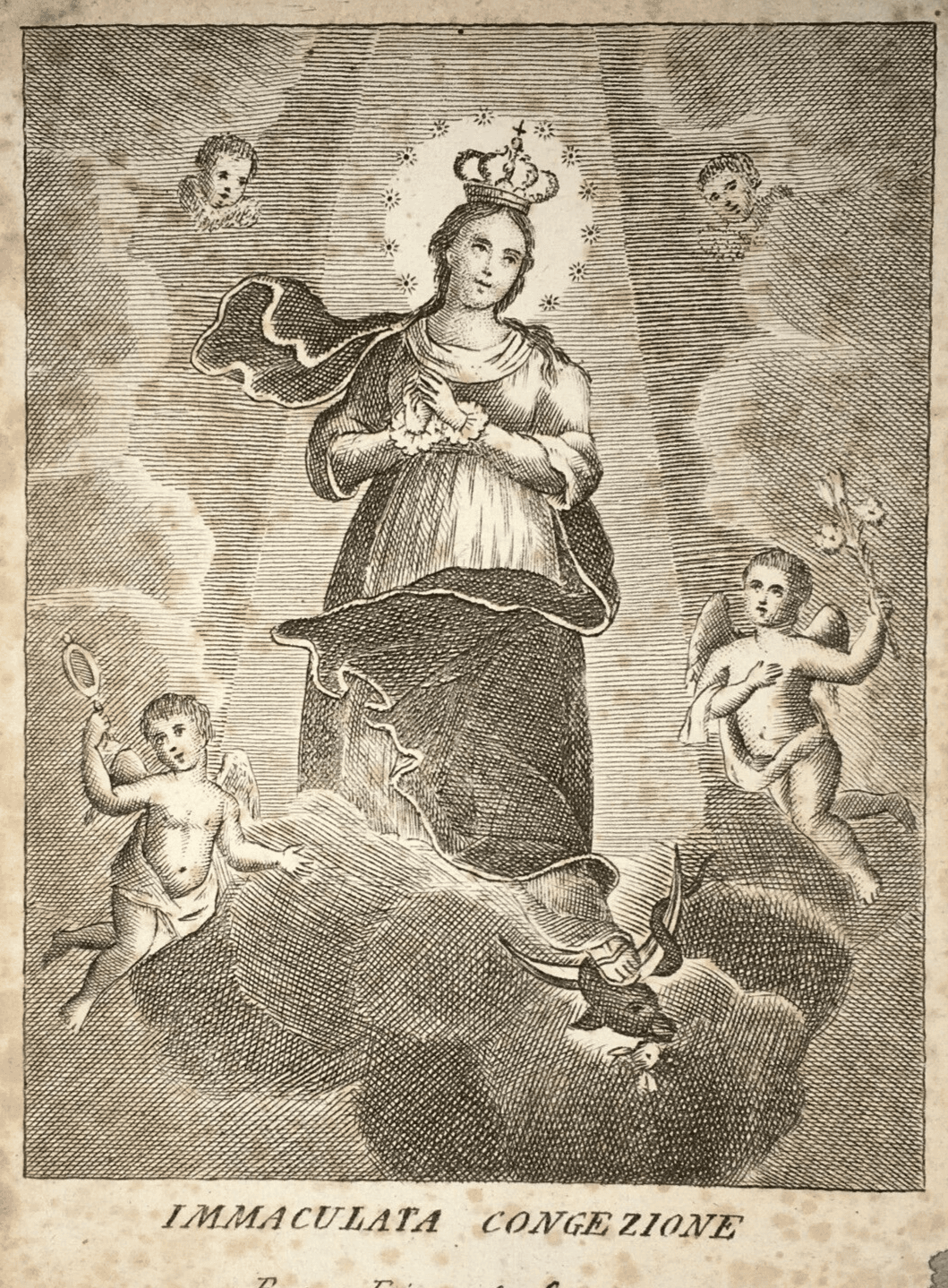 Antica Stampa Popolare Devozionale: Madonna Immacolata. Incisione Di Francesco Scafa