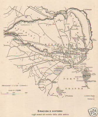 Sicilia, Siracusa E Dintorni: Antica Mappa Litografica, Fine '800