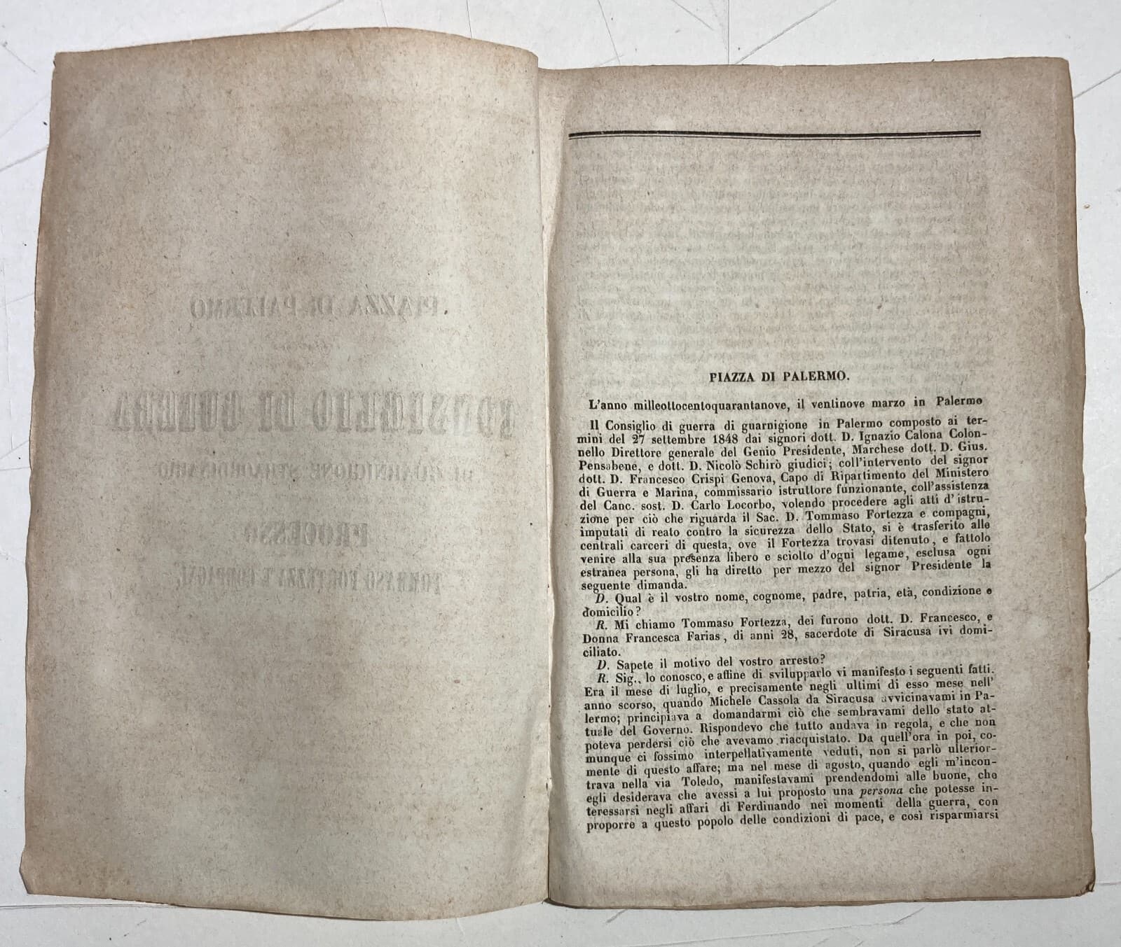 Risorgimento. Sicilia. Palermo. Processo Fortezza. Consiglio Di Guerra. Rara Edizione