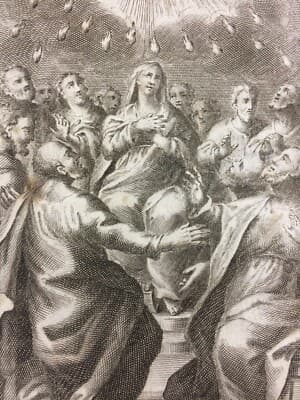 Antica Stampa Popolare Devozionale: Scena Biblica Della Pentecoste Incisore G.B. Sintes
