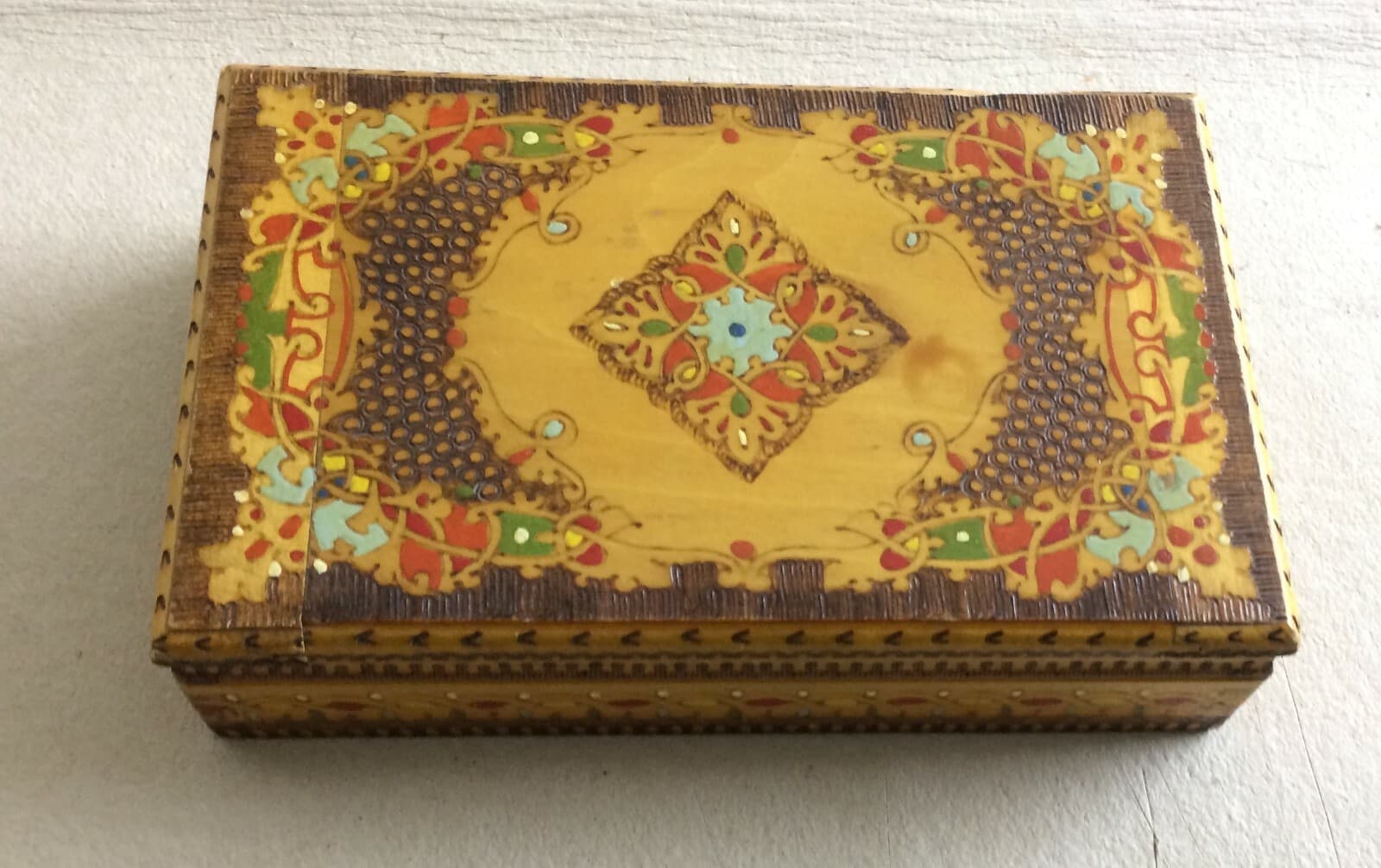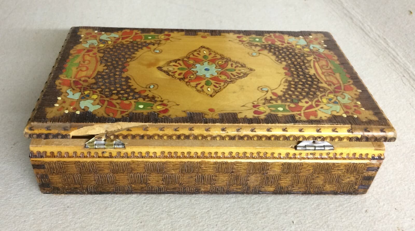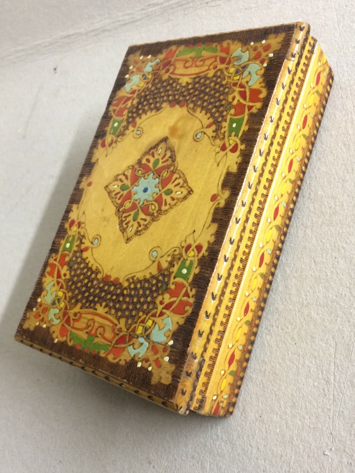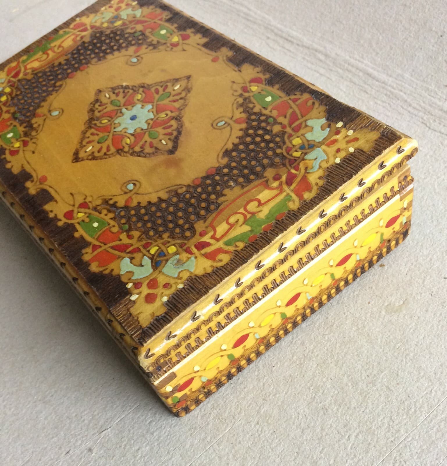 Scatola Porta Sigarette In Legno Con Motivi Policromi Pirografati
