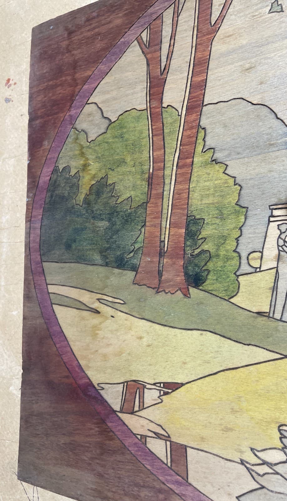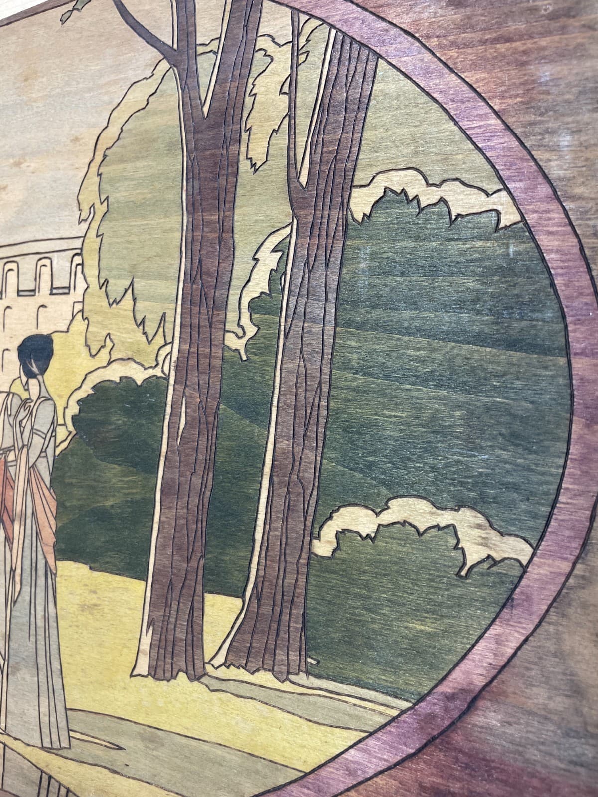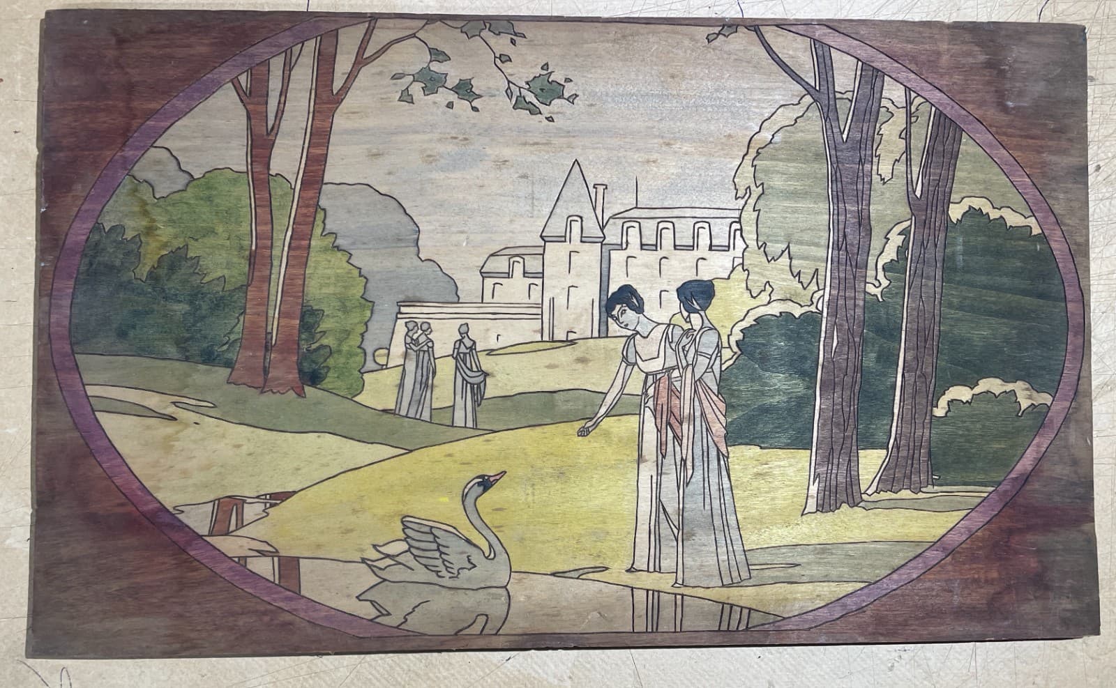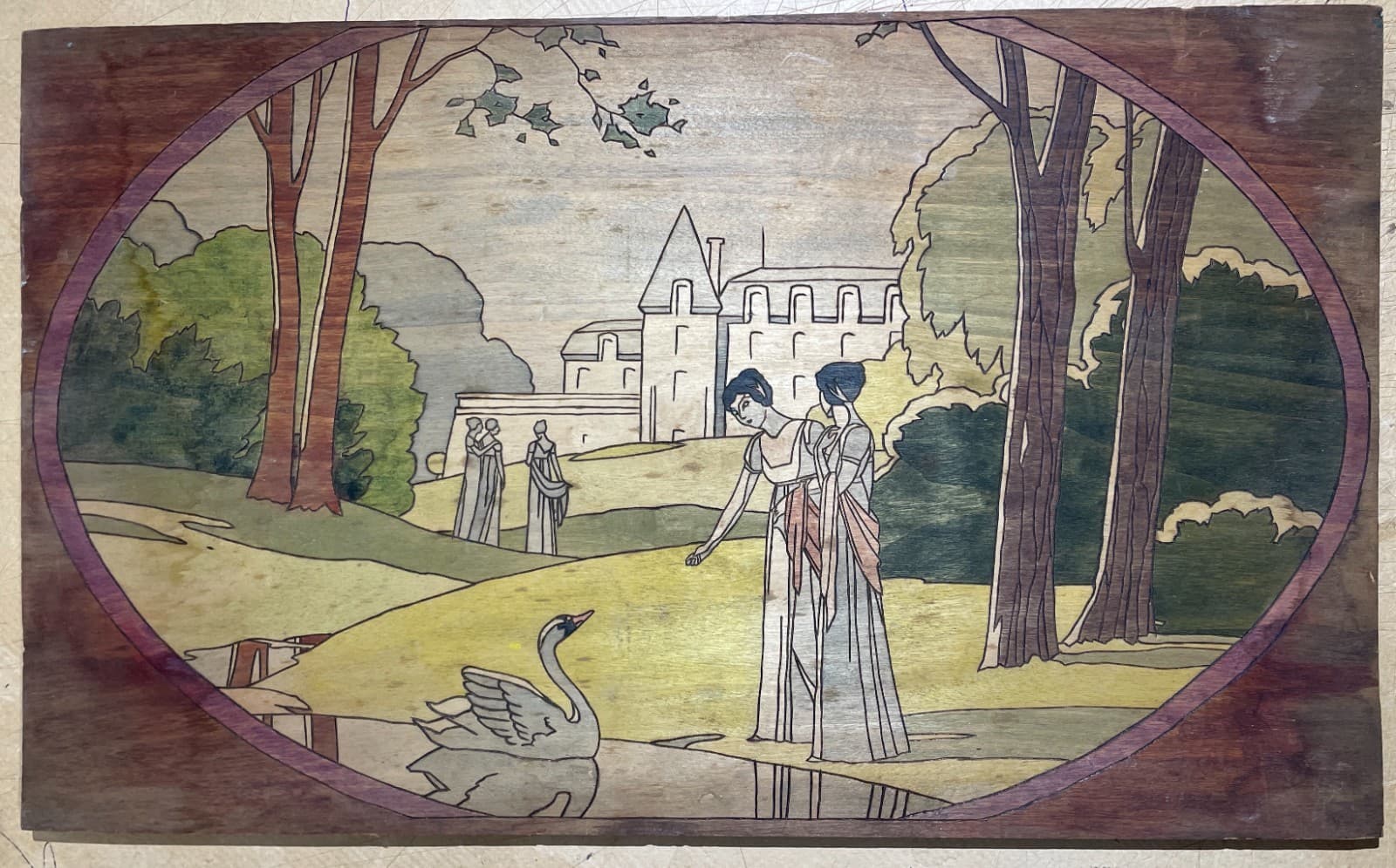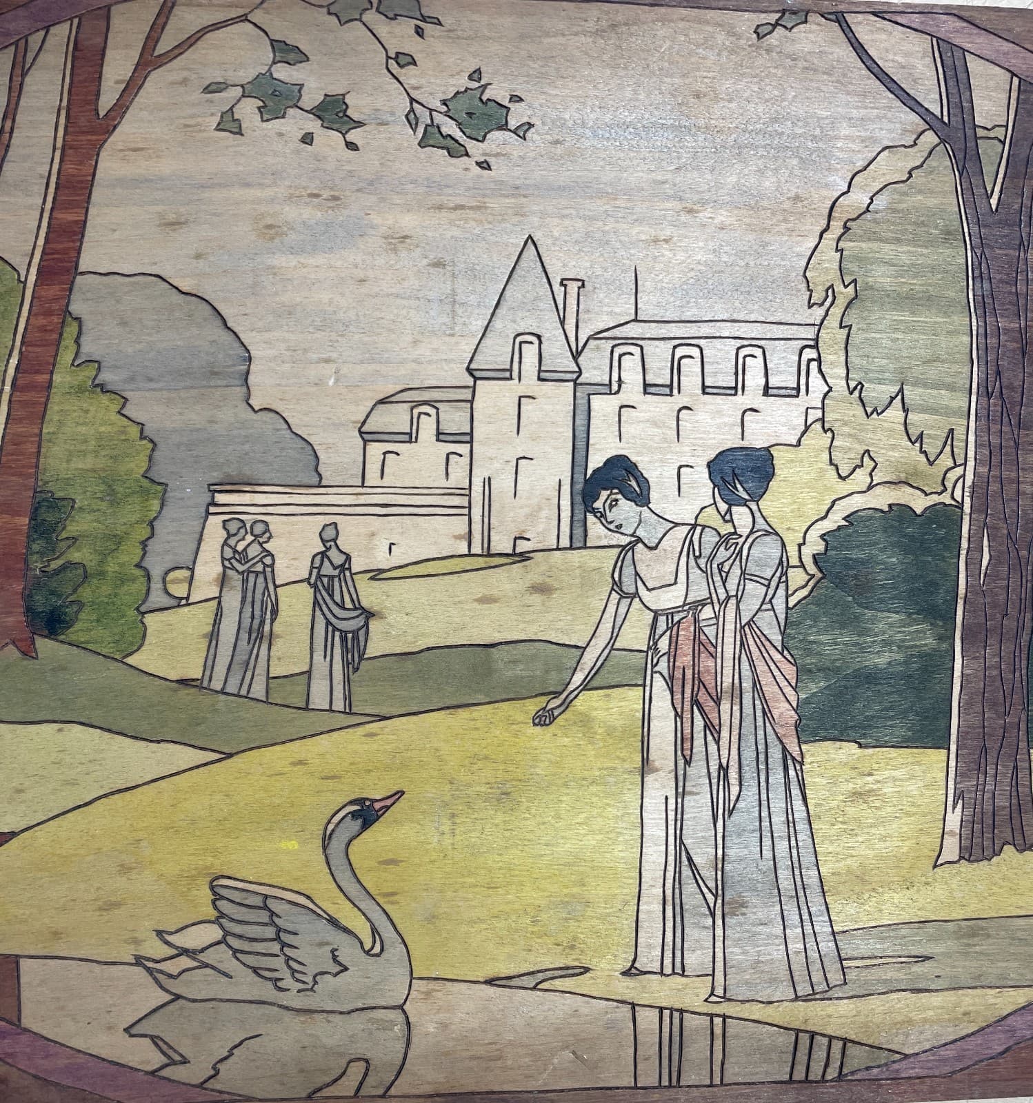 Illustrazione Artistica: Figure Femminili Con Cigno, Pannello Pirografato Stile Liberty