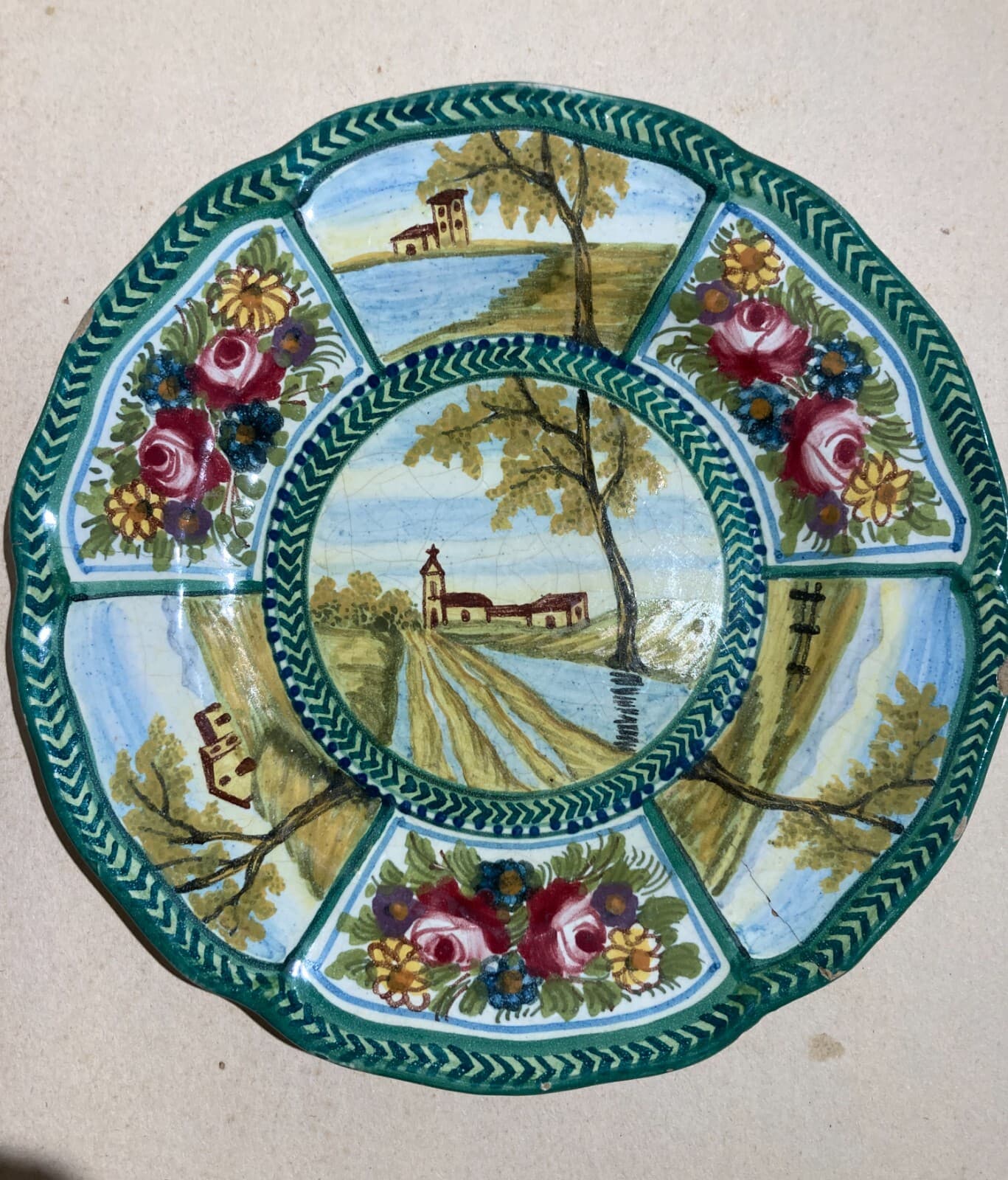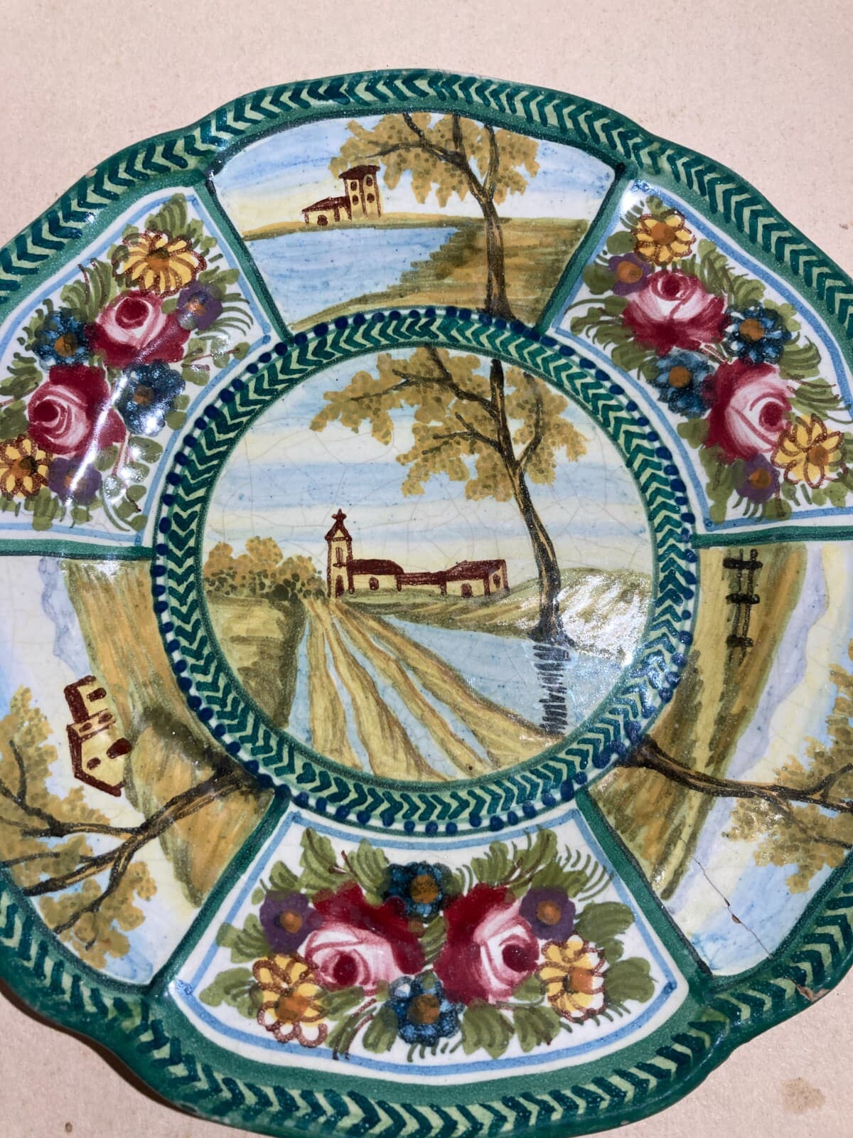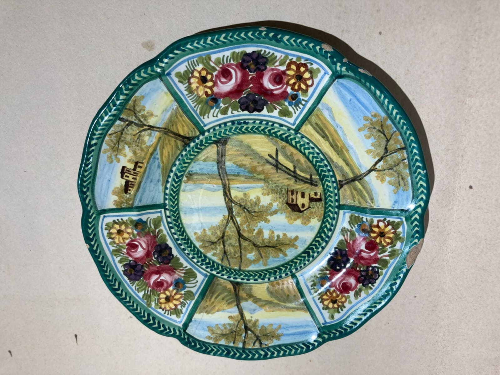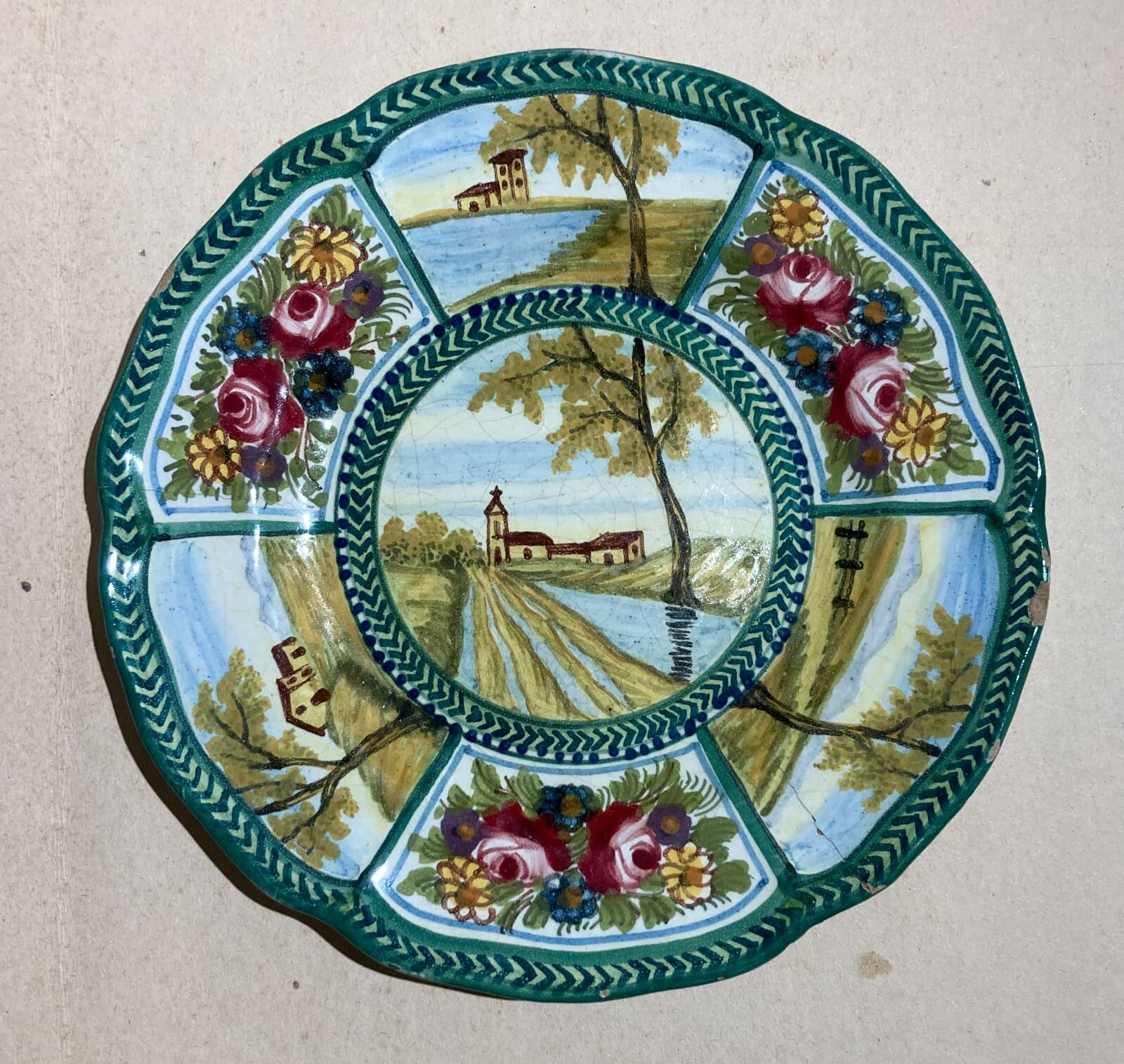 Decorativo Piatto In Ceramica, Paesaggi E Decori Floreali, Abruzzo, Bozzelli, '900