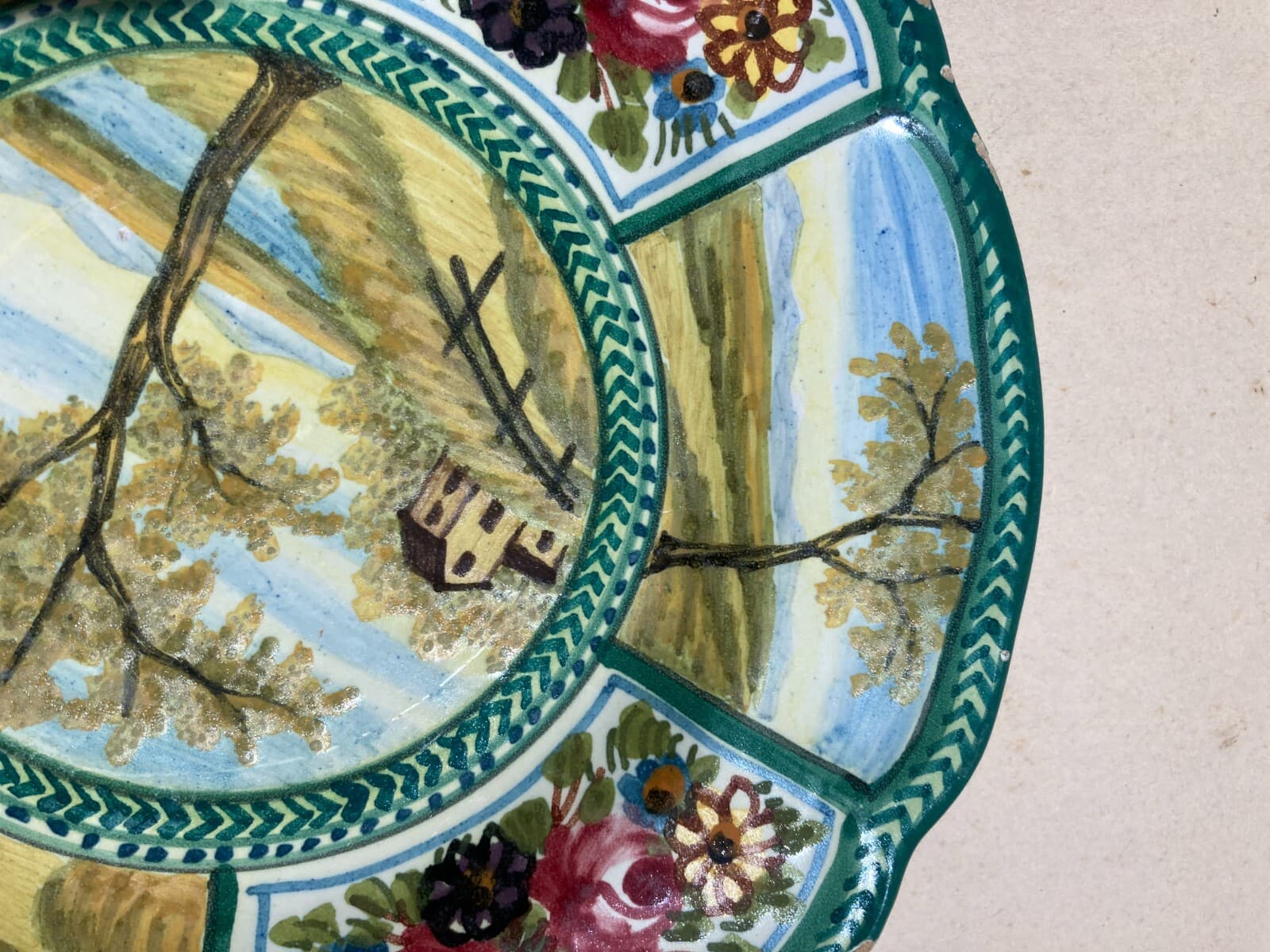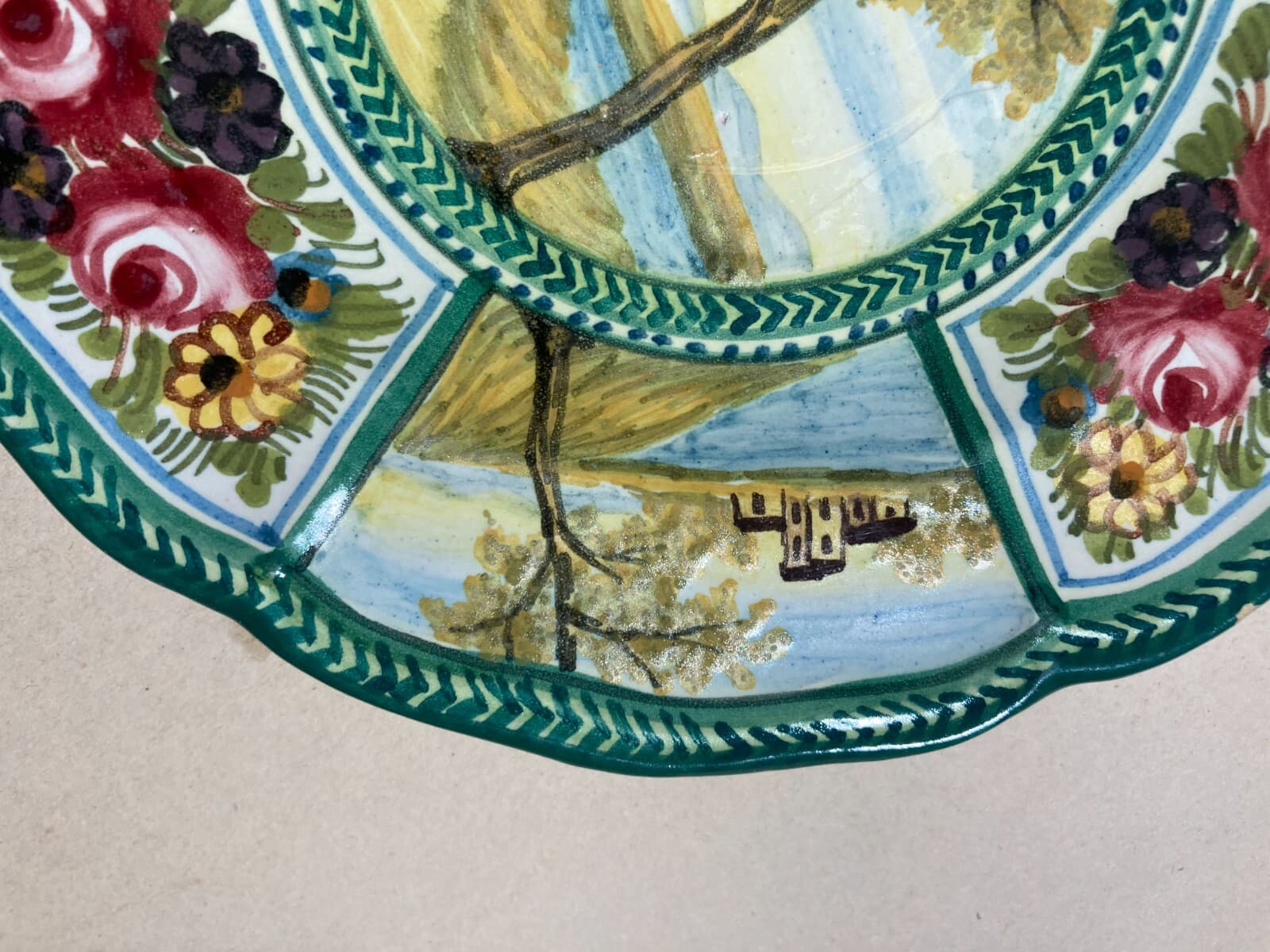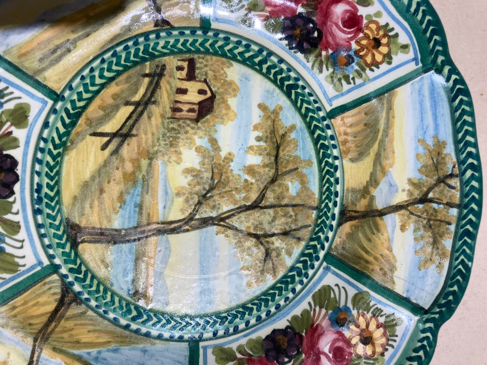 Piatto Decorativo In Ceramica Con Paesaggi E Decori Floreali, Ceramiche Bozzelli, Abruzzo