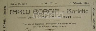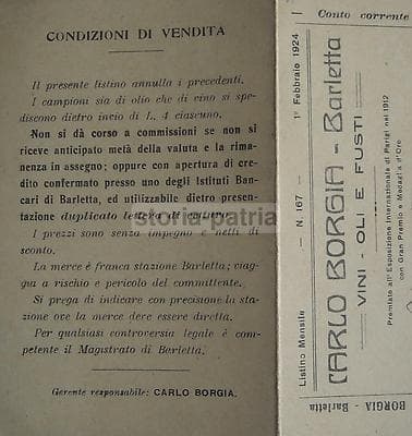 Enologia, Vino, Olio: Antico Listino, Puglia, Barletta, Borgia. Pieghevole d'Epoca, 1924