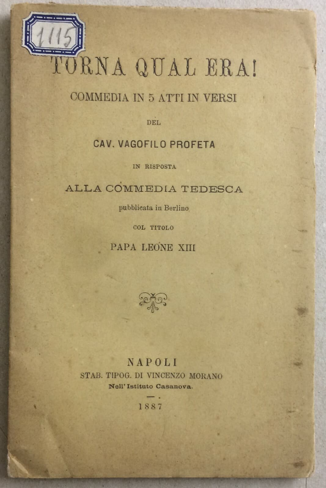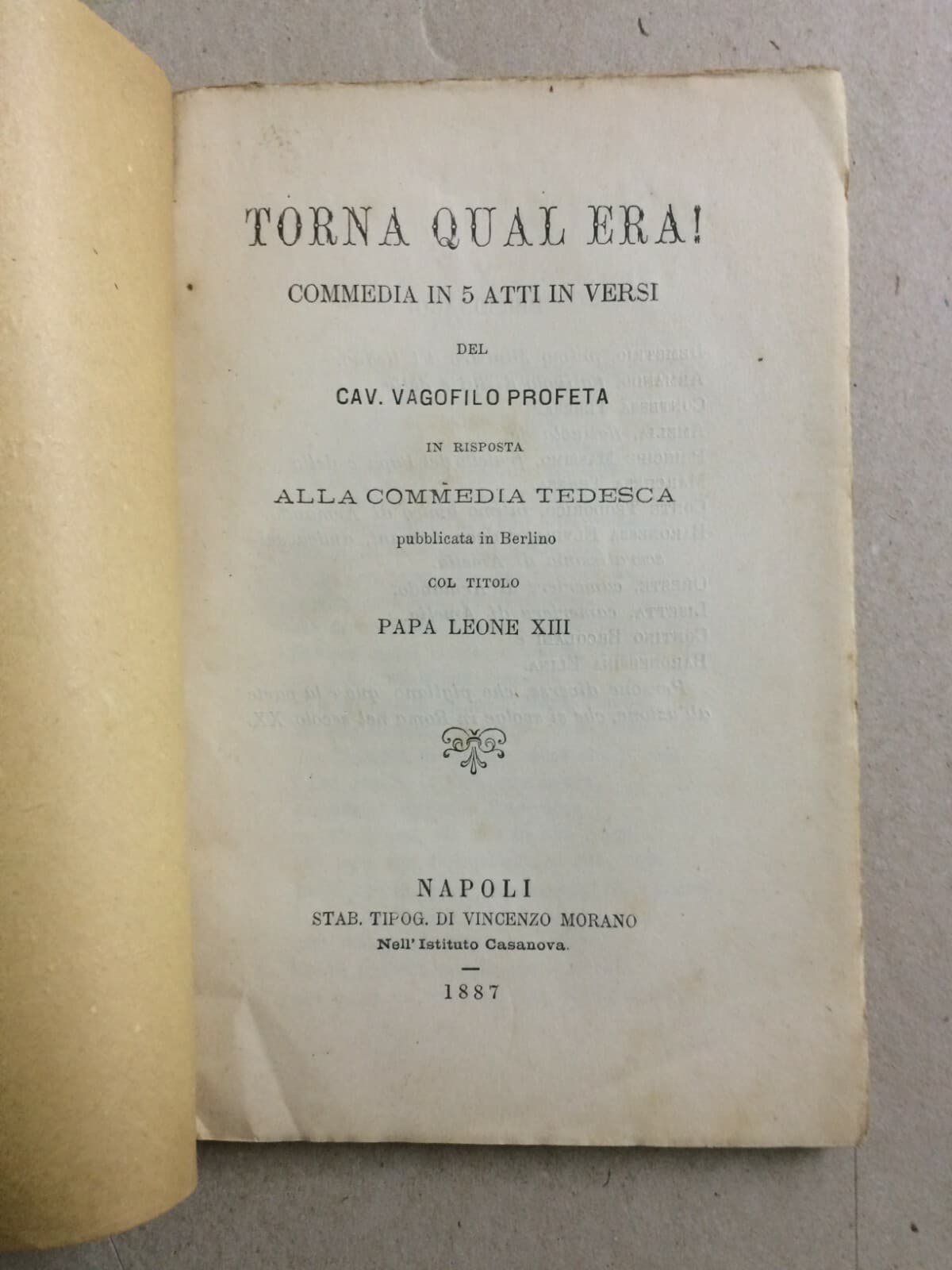 Teatro Vagofilo Profeta: Torna Qual Era! Papa Leone XIII, Berlino, Antica Commedia, Napoli, 1887 Raro