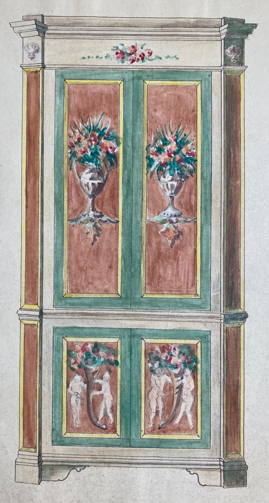 Arti Decorative: Progetto Di Mobile Dipinto, Acquerello Con Cornucopie E Decori Floreali