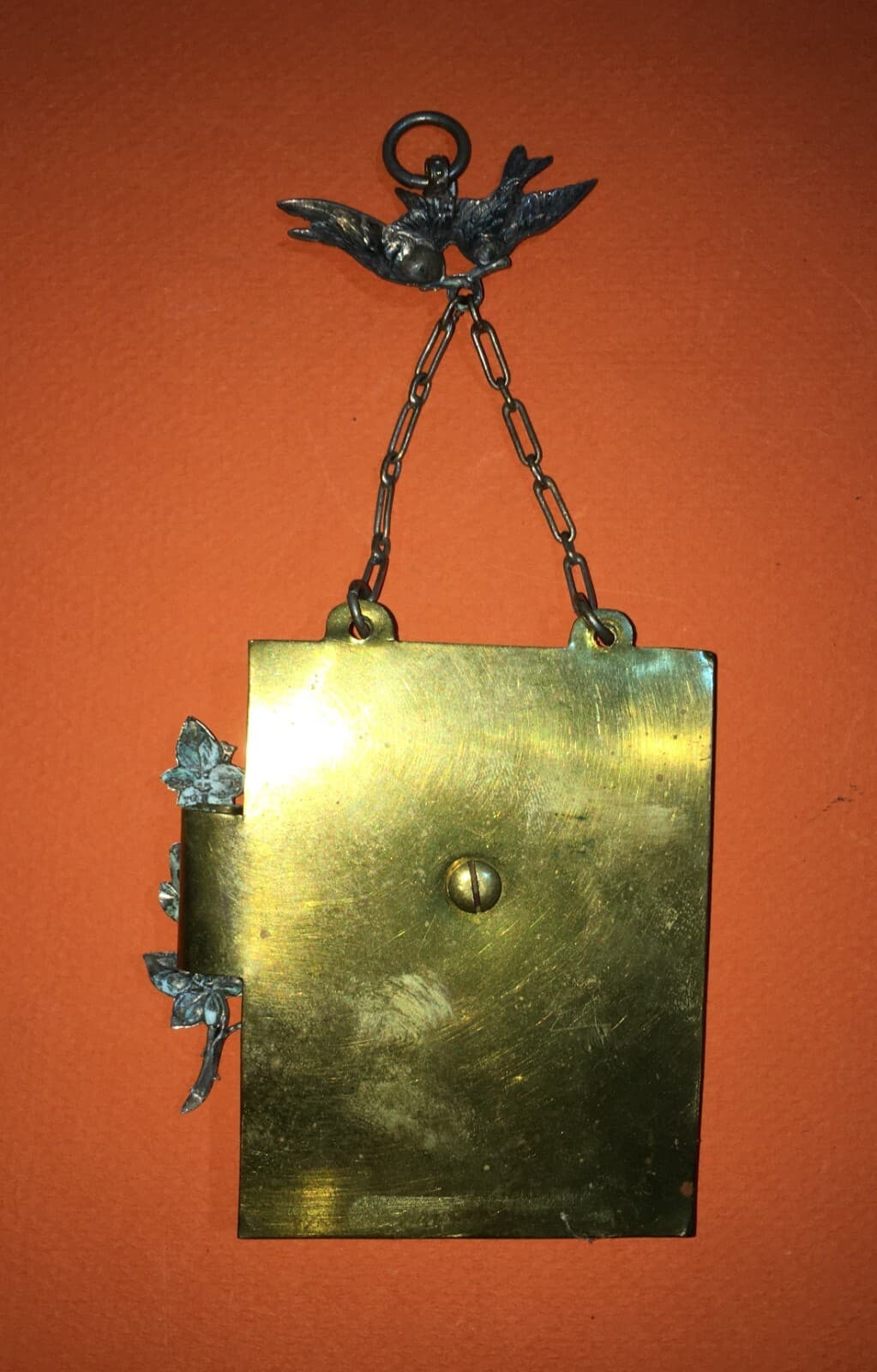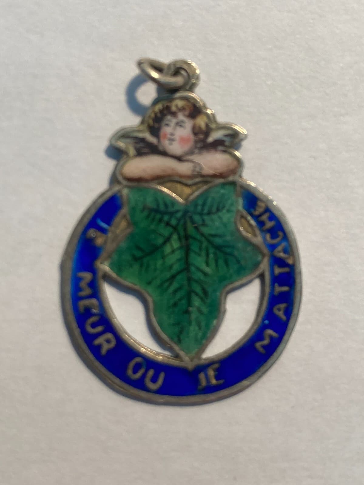 Antica Medaglia Pendente Con Angioletto, Edera E Decori Smaltati Policromi