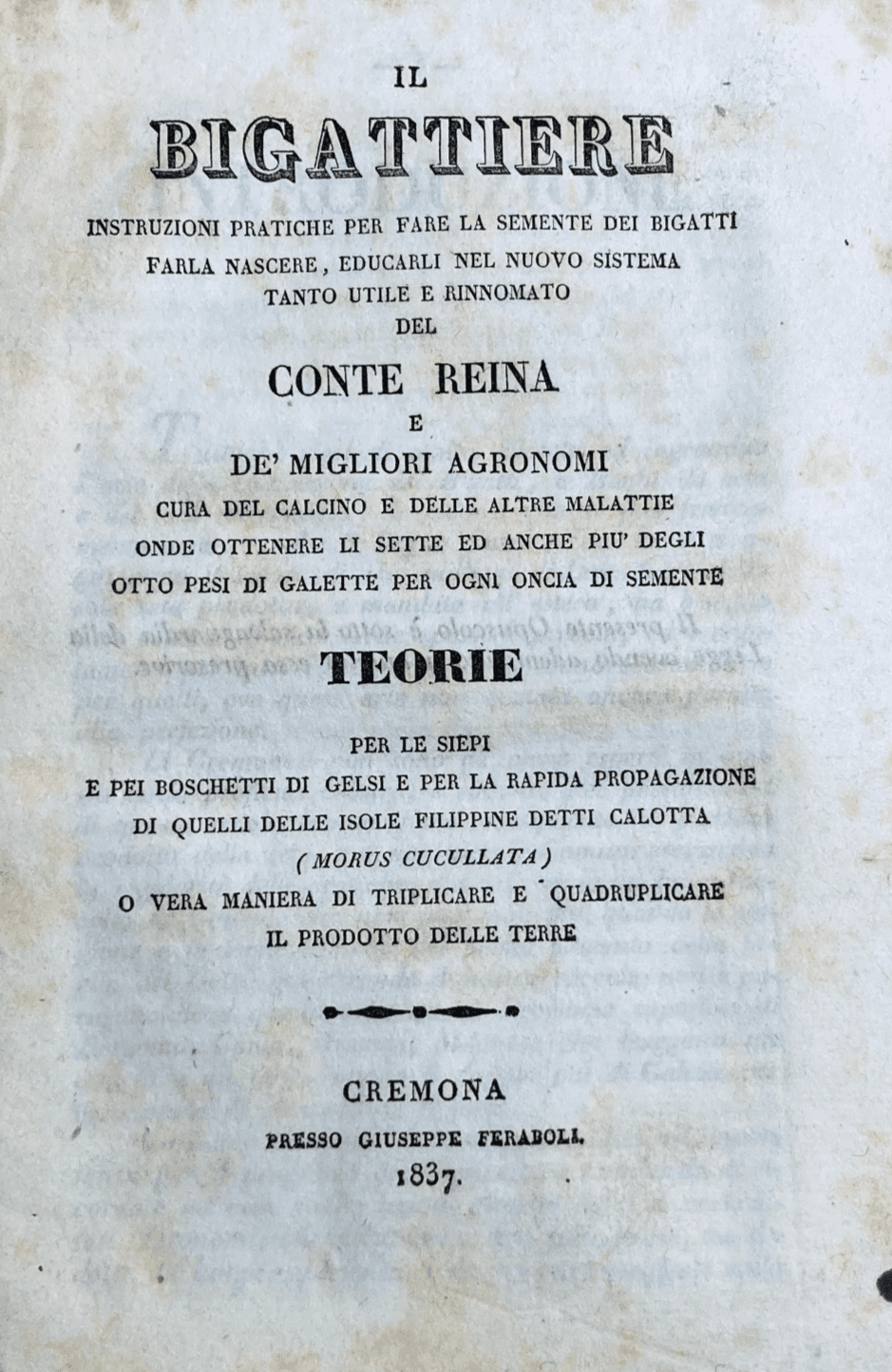 Il Bigattiere: Istruzioni Per L'Allevamento Dei Bachi Da Seta E La Coltivazione Dei Gelsi, Cremona