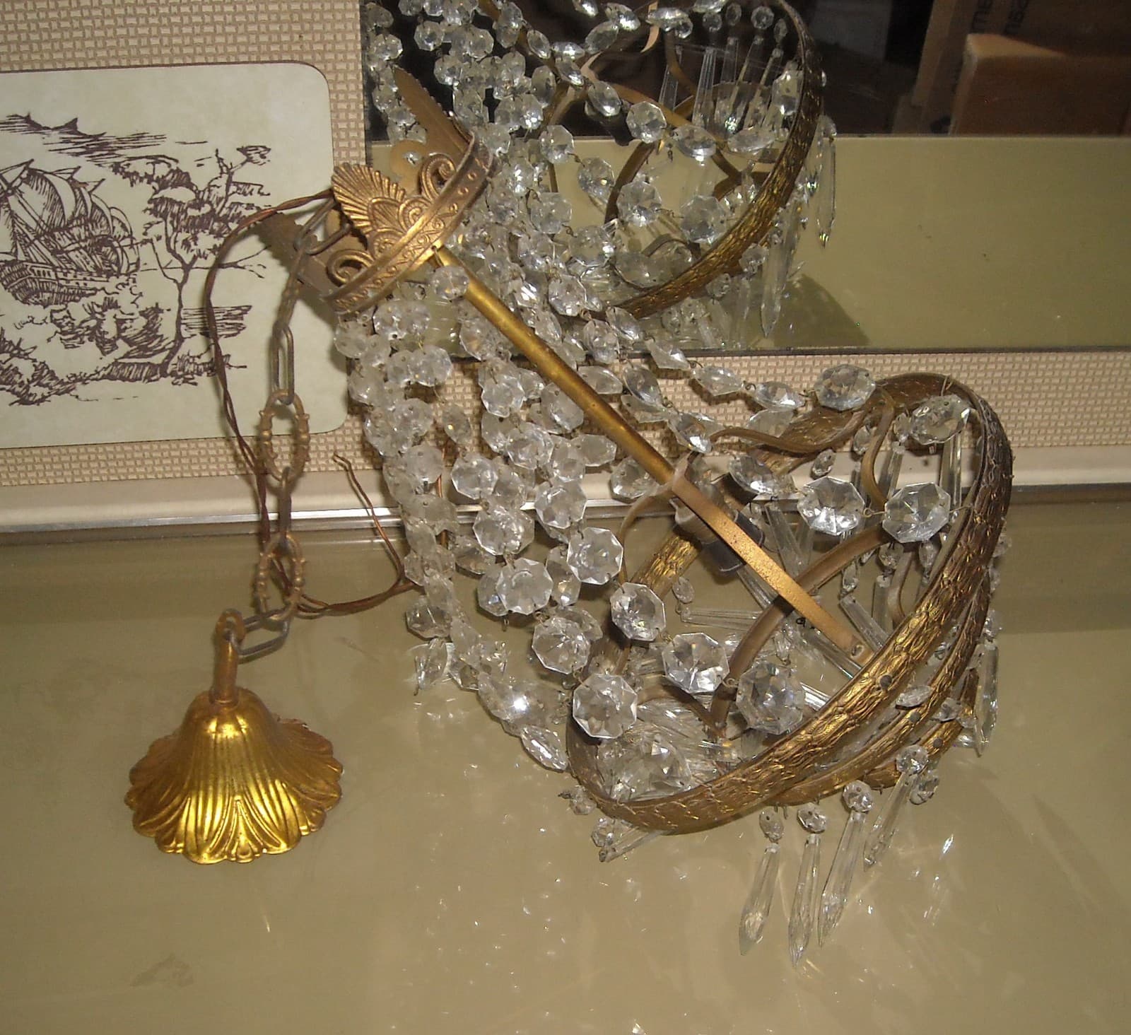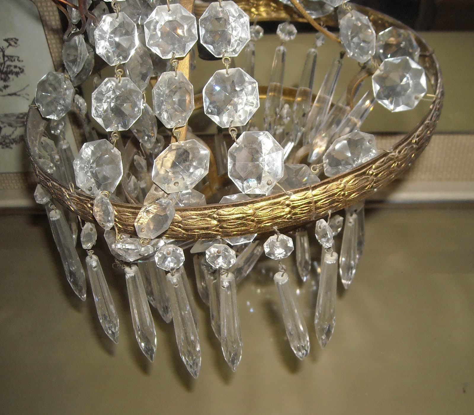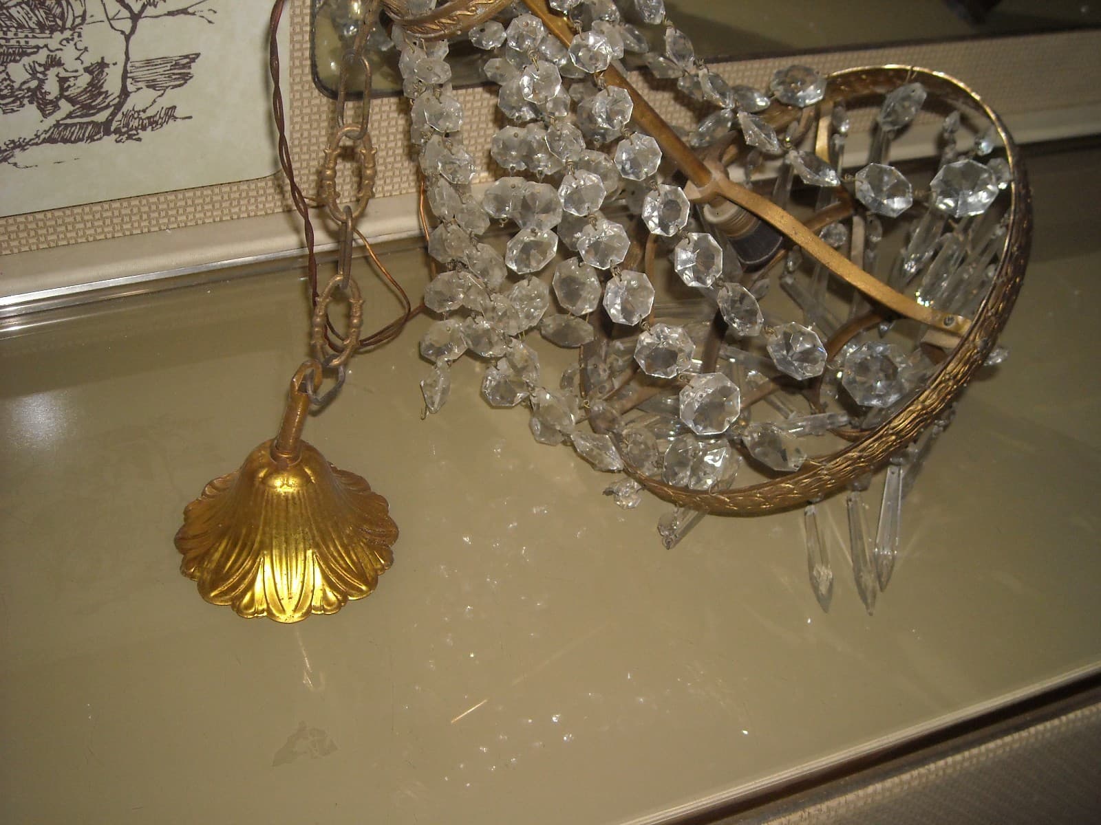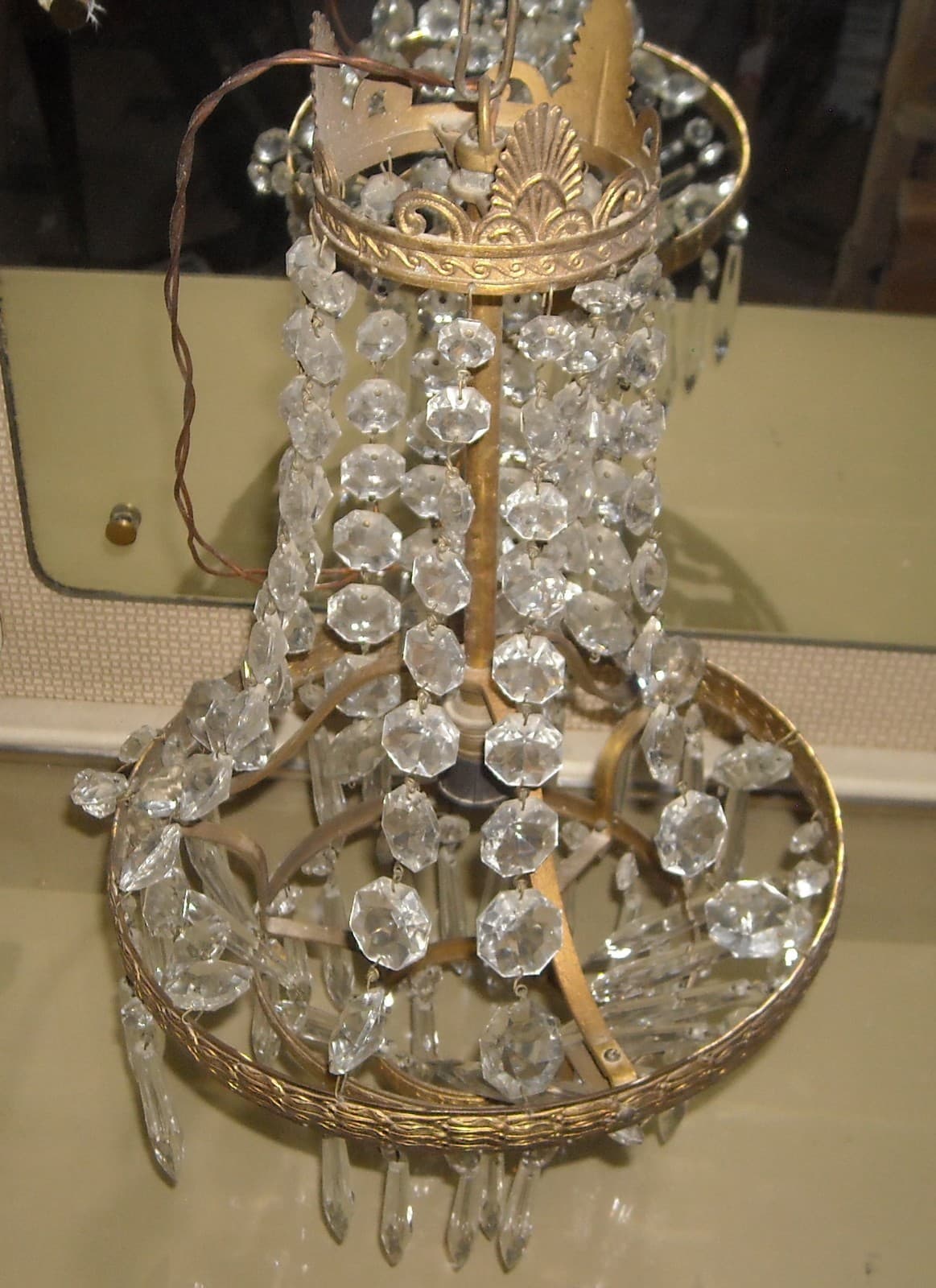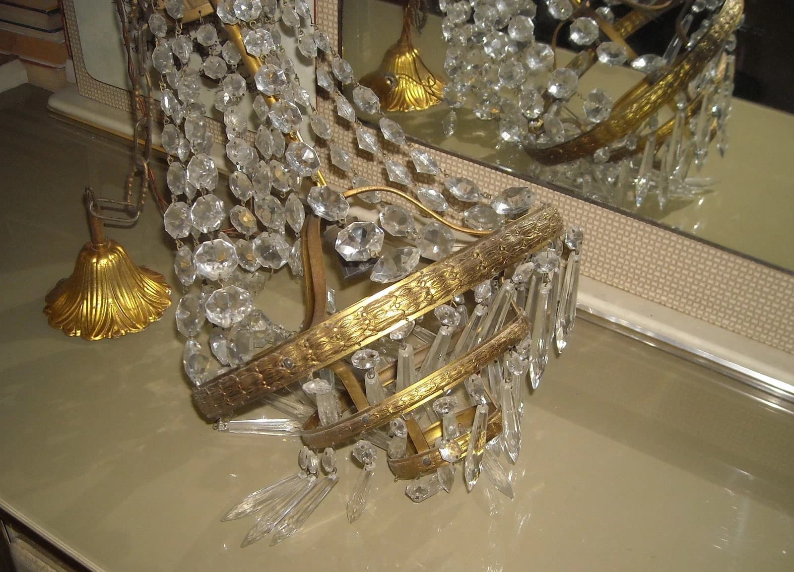 Lampadario In Ottone Dorato Con Prismi In Vetro