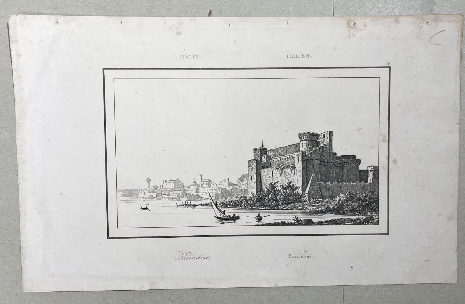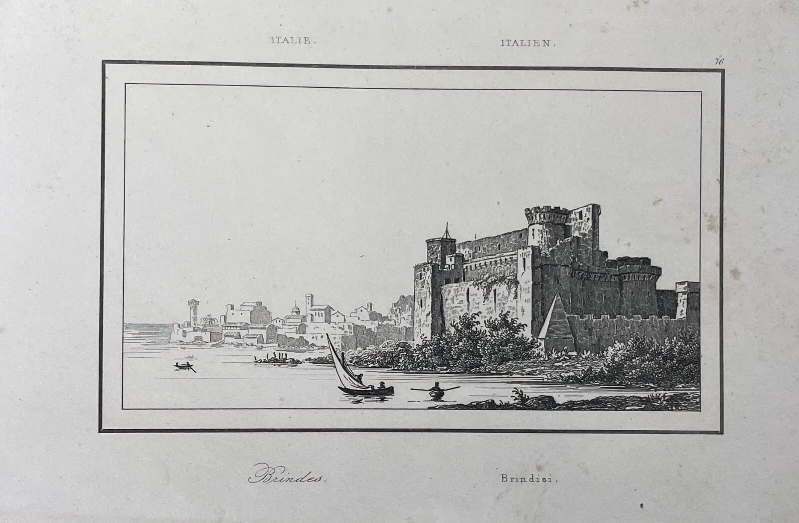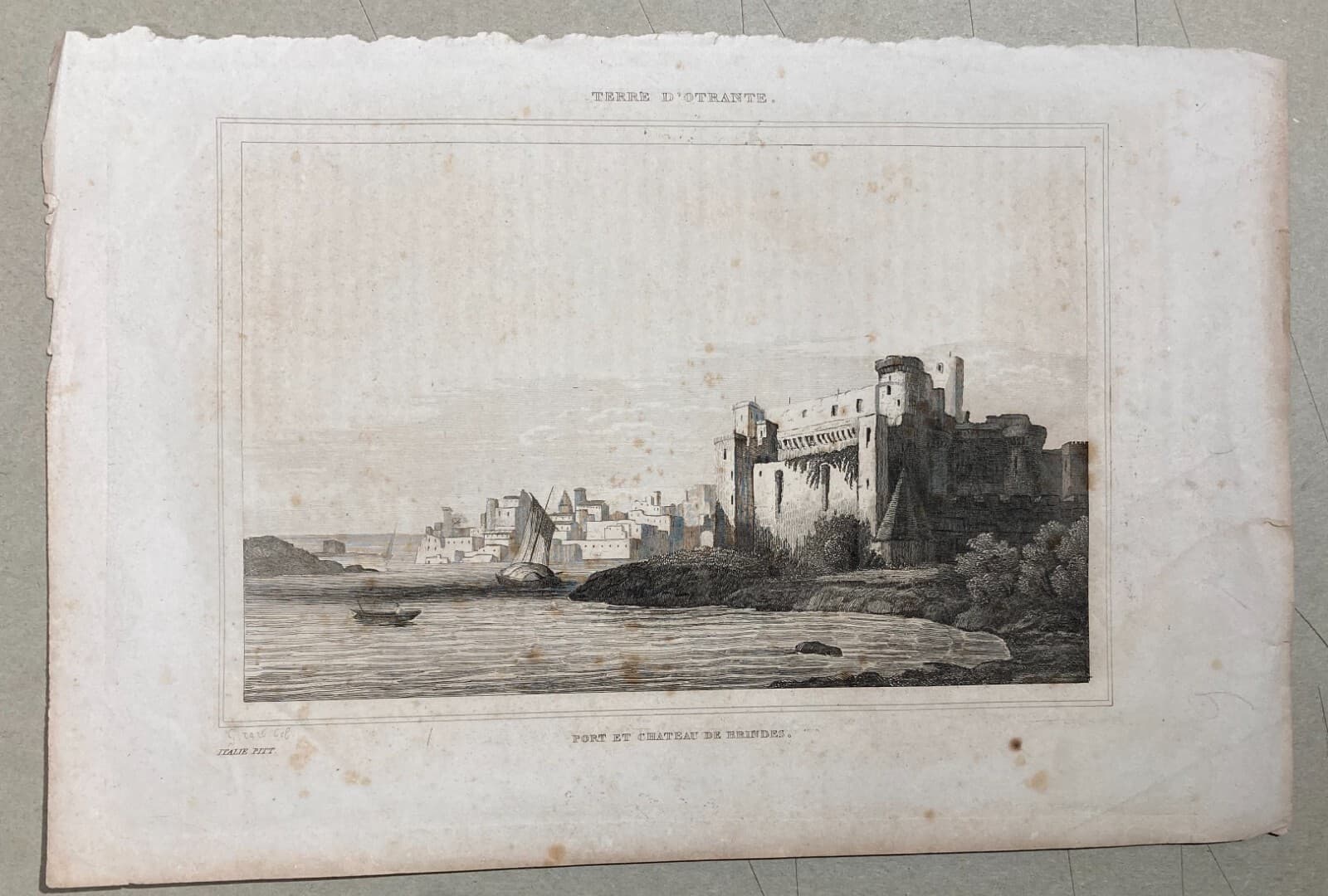 Puglia, Salento, Brindisi. Antica Veduta Litografica: Castello, Barche, Panoramica