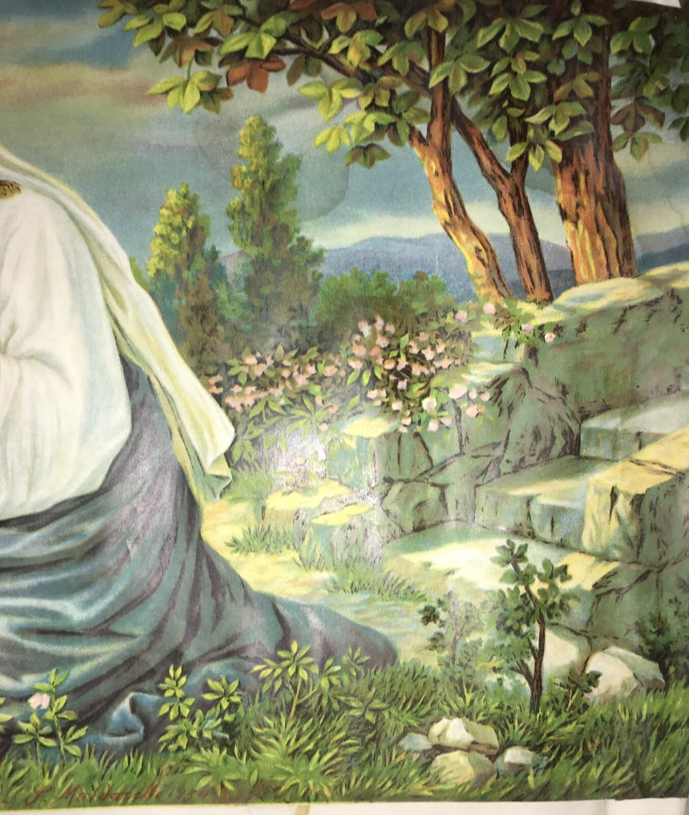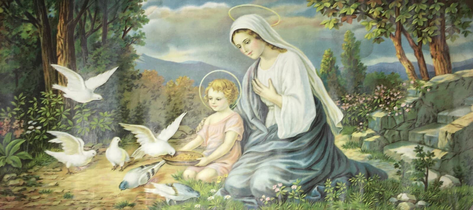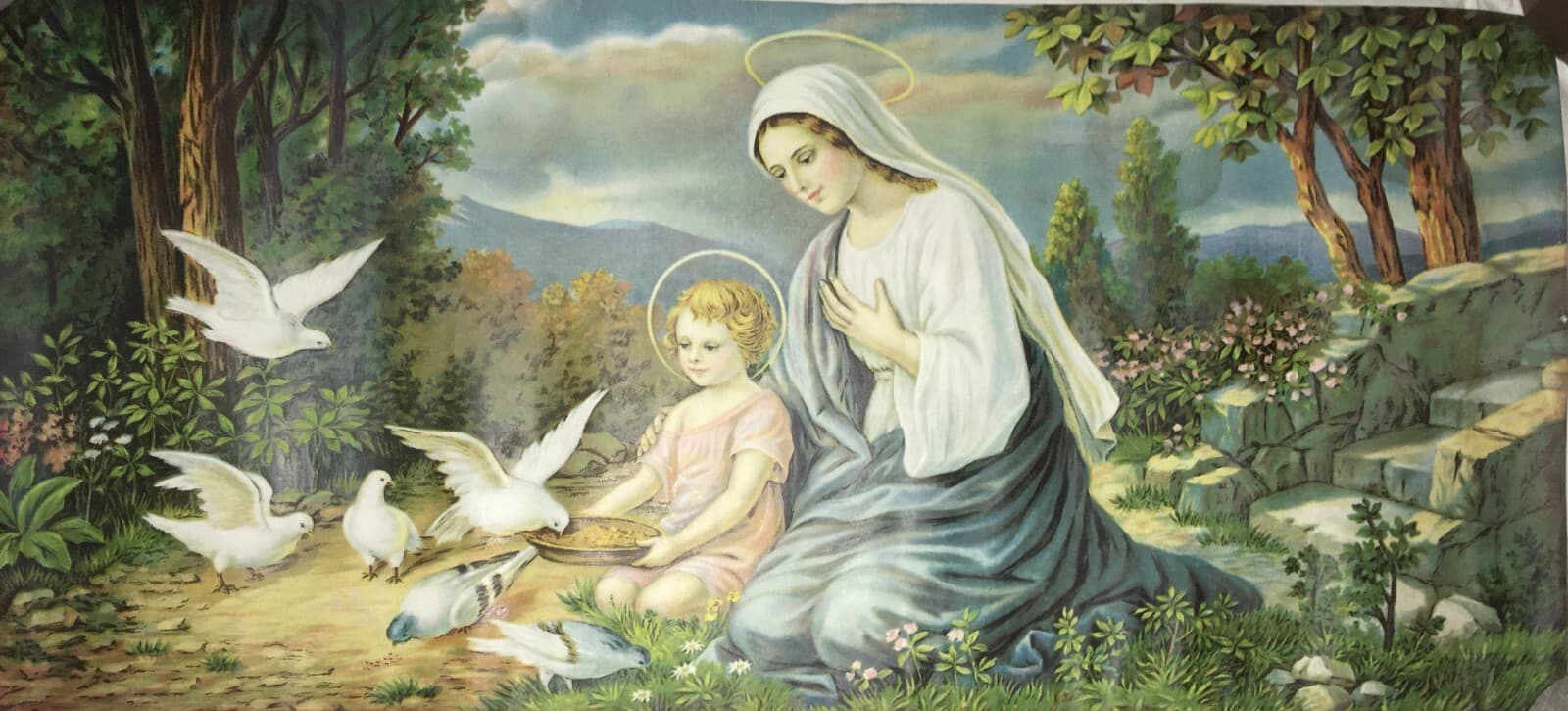 Madonna Con Bambino: Paesaggio Con Colombe. Cromolitografia d'Epoca Di Maldarelli, 1934