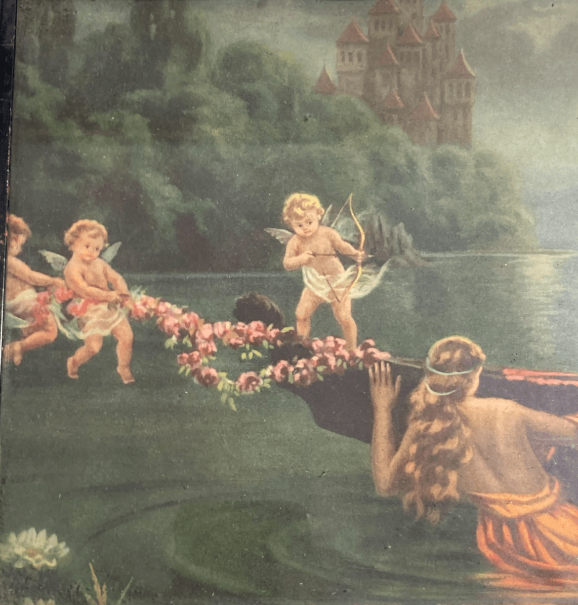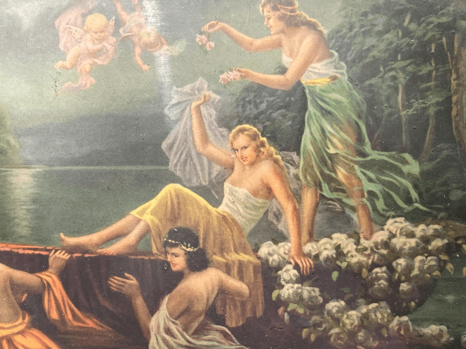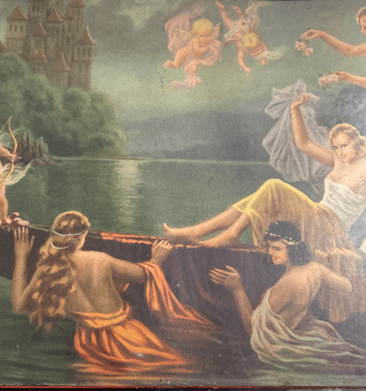 Scena Mitologica Con Ninfe E Puttini Lago Con Castello Stampa Oleografica
