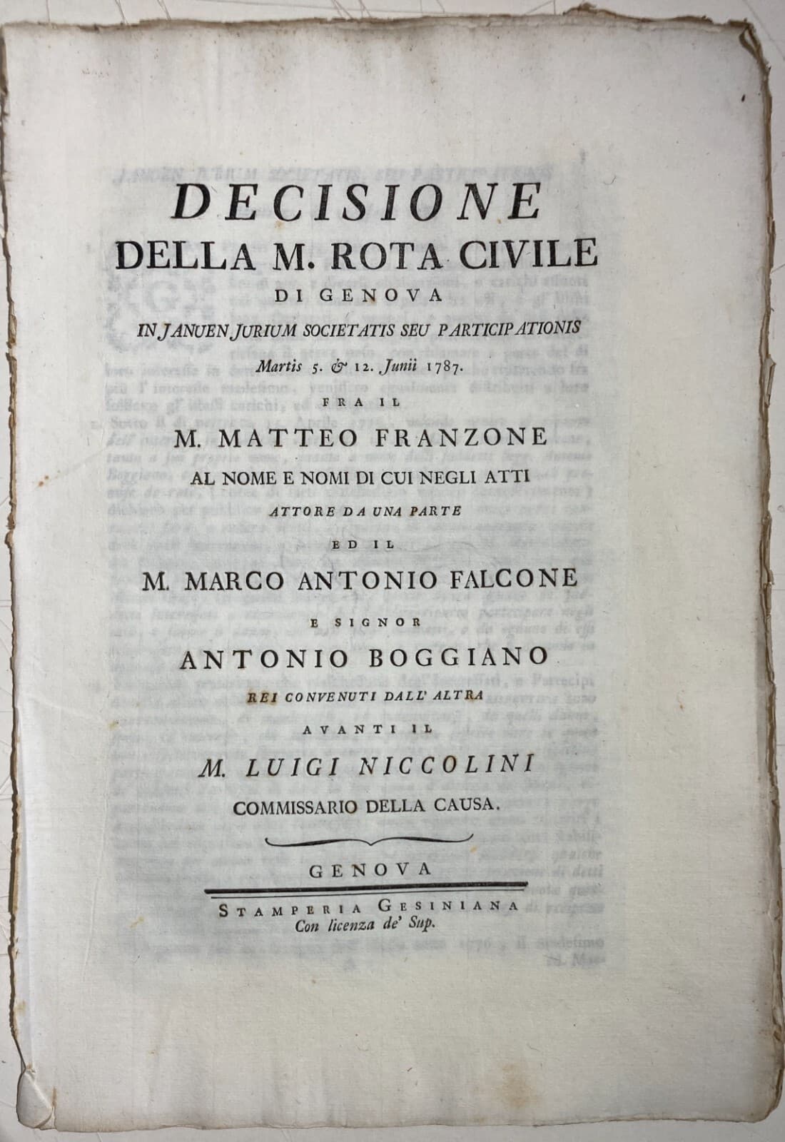 Liguria, Genova: Antica Allegazione Giuridica Franzone, Falcone, Boggiano, Ilarj (1787)