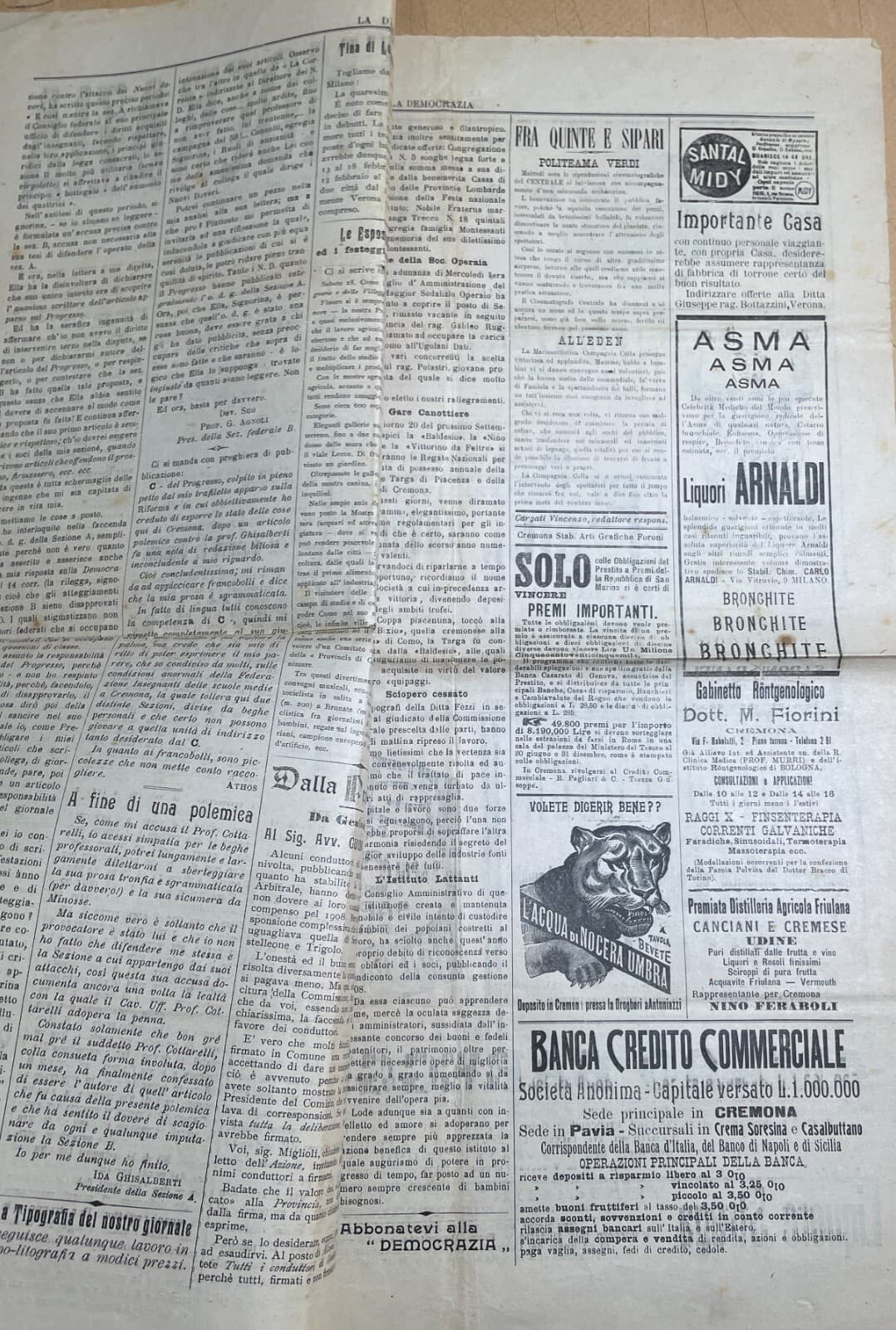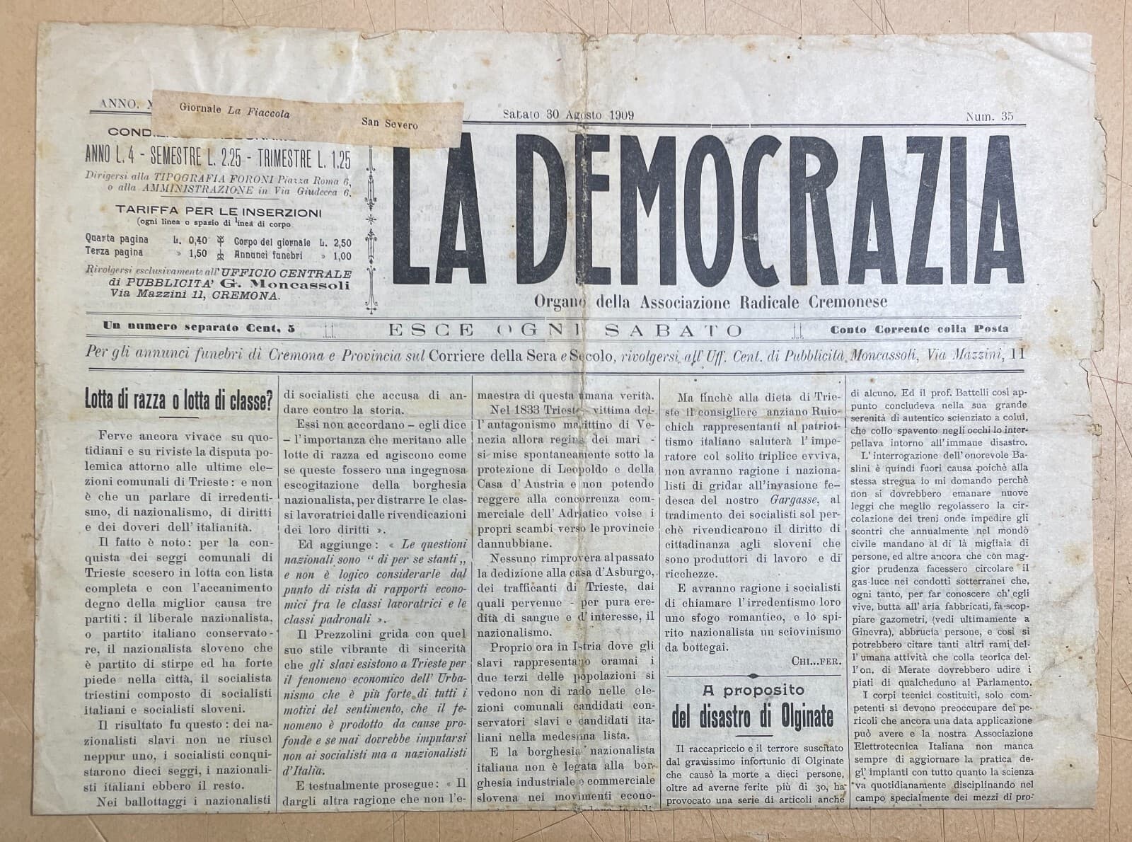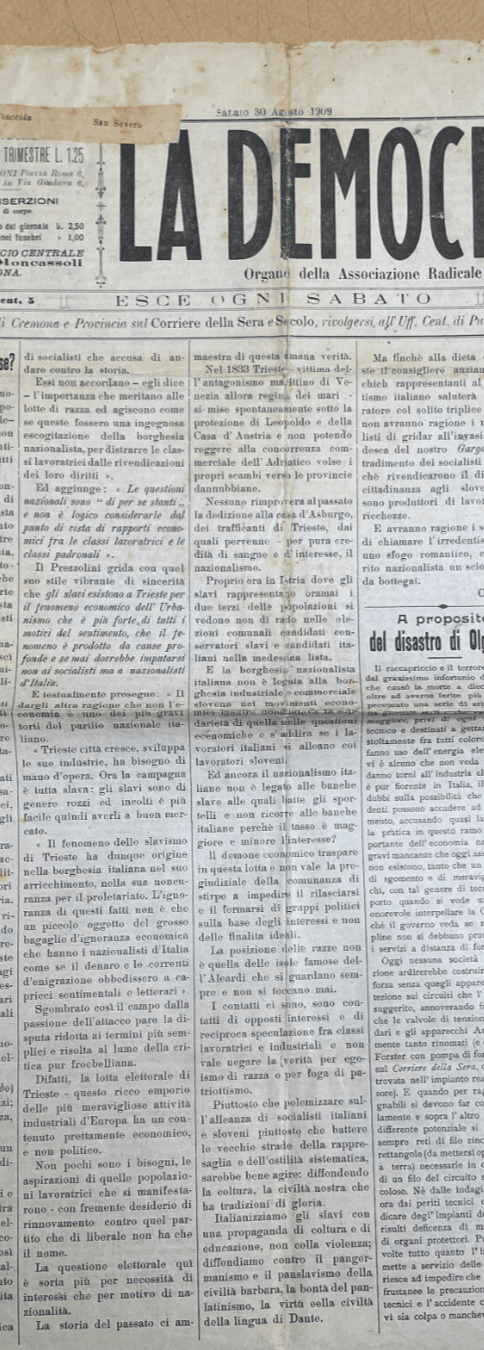 Antico Giornale La Democrazia: Cremona, Associazione Radicale, 1909