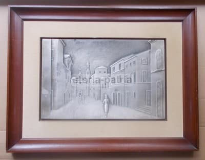 Pannello Decorativo In Argento 925 Di Ottaviani, Veduta Di Paese Con Chiesa, 1974