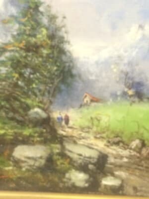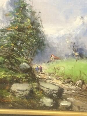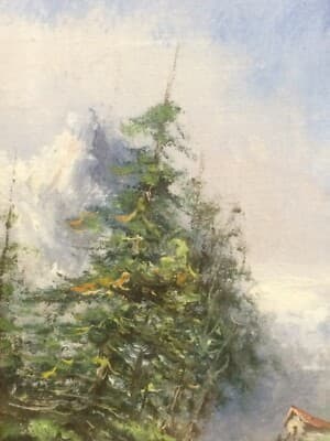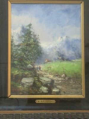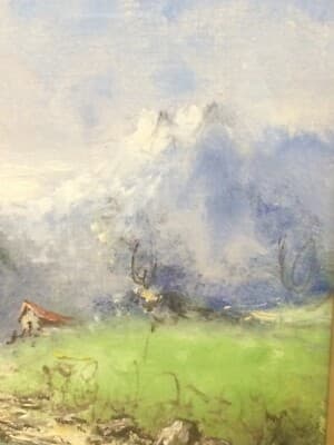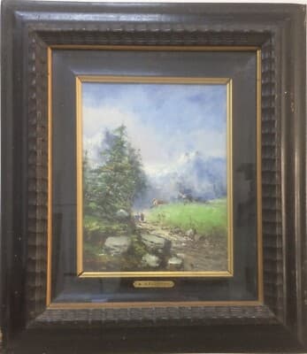 Athos Brioschi, Paesaggio Alpino Con Figure, Olio Su Cartone In Cornice Ebanizzata