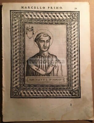 Storia Del Papato: Ritratto Del Pontefice Marcello I. Incisione Del XVI Secolo Con Araldica.