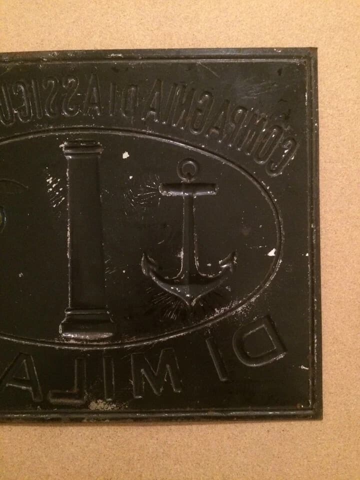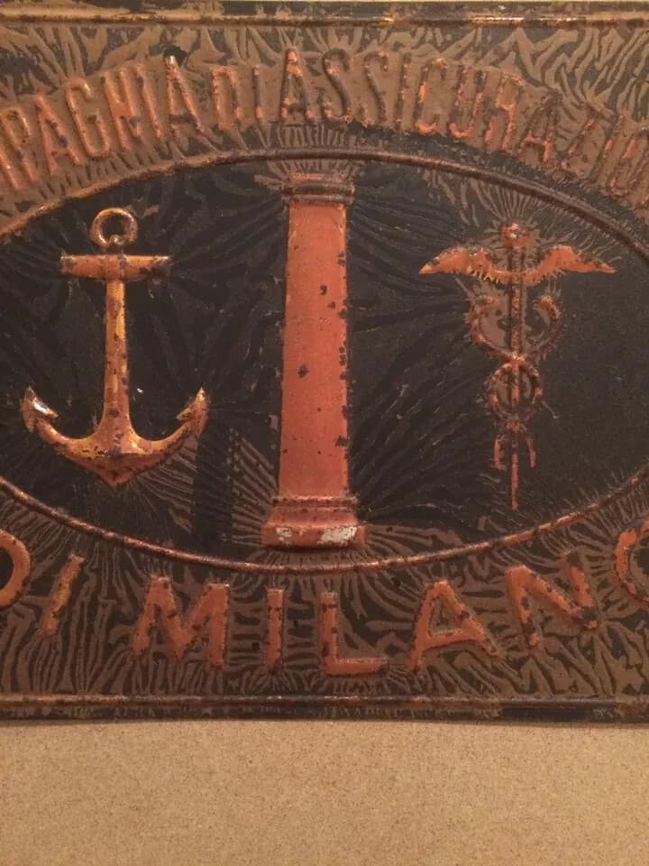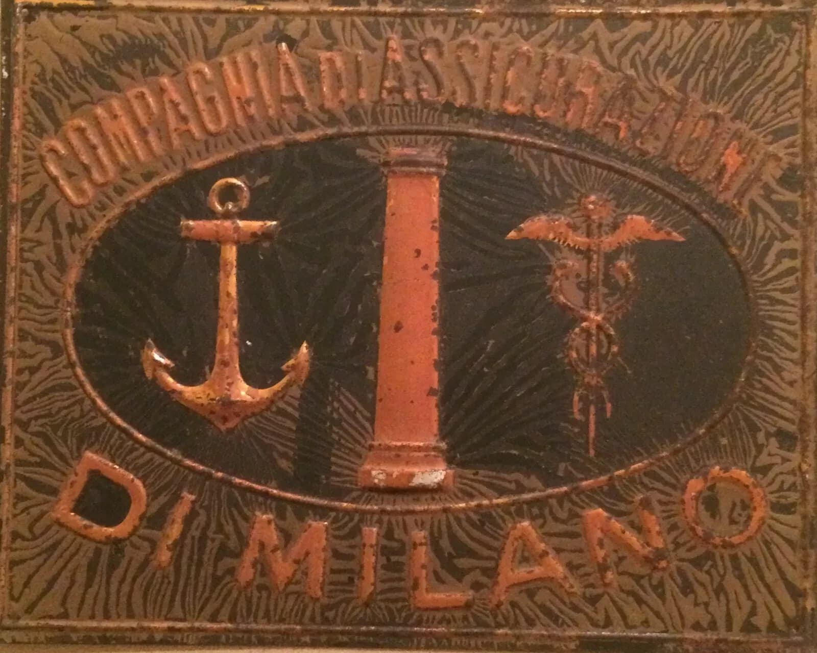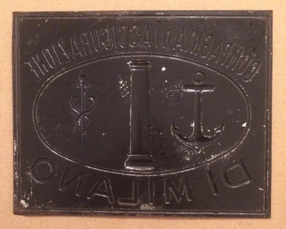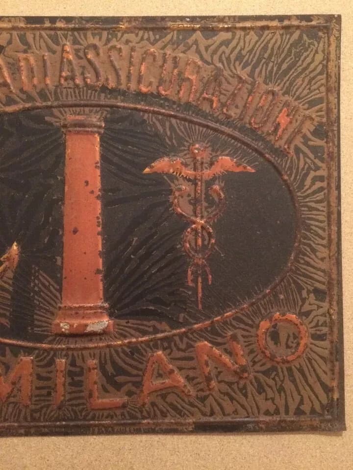 Assicurazioni: Targa Pubblicitaria In Latta Sbalzata, Milano Caduceo E Ancora
