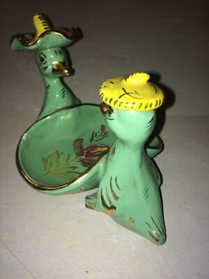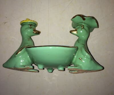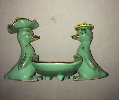 Soprammobile In Ceramica Con Figure Di Paperi E Cestino Svuotatasche