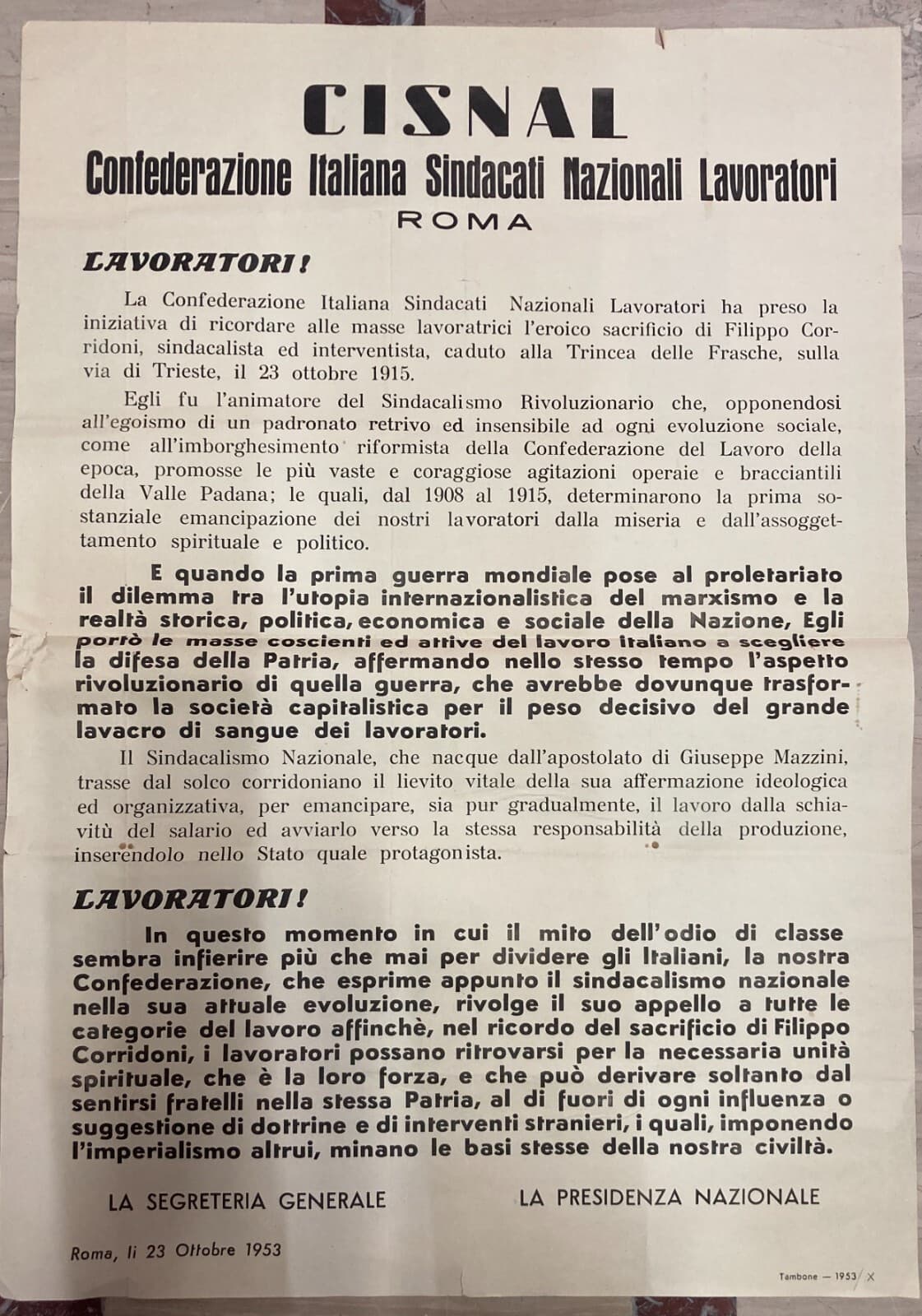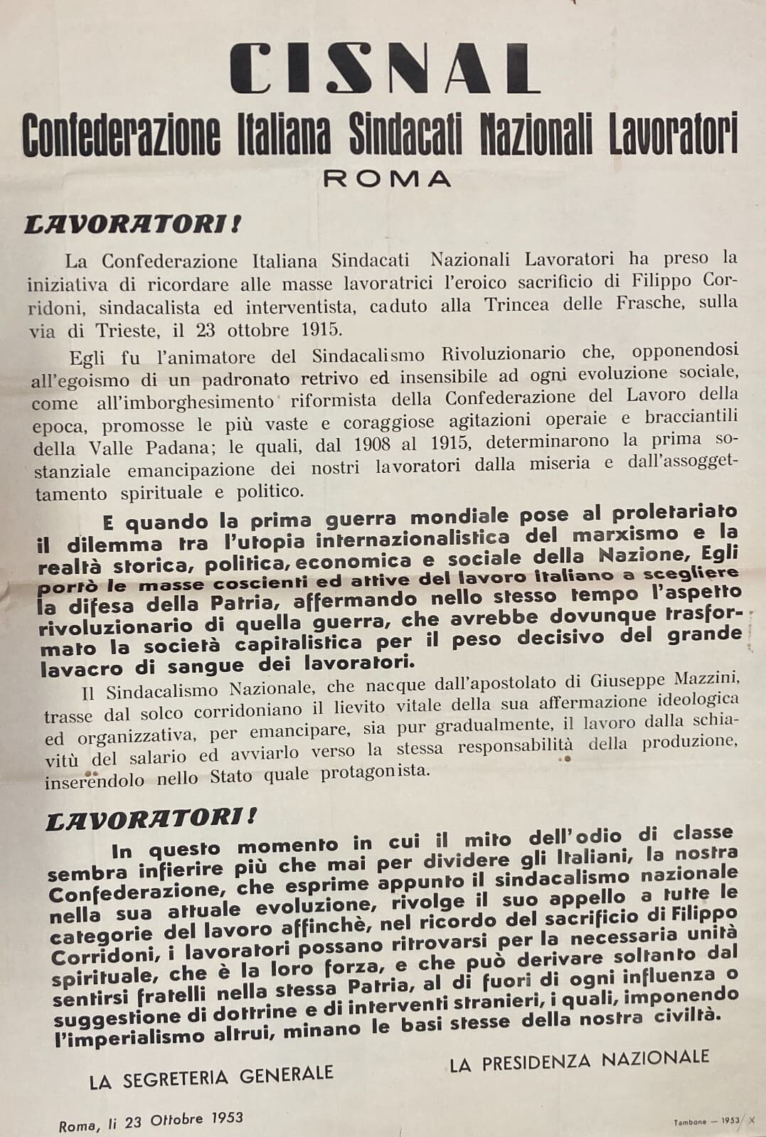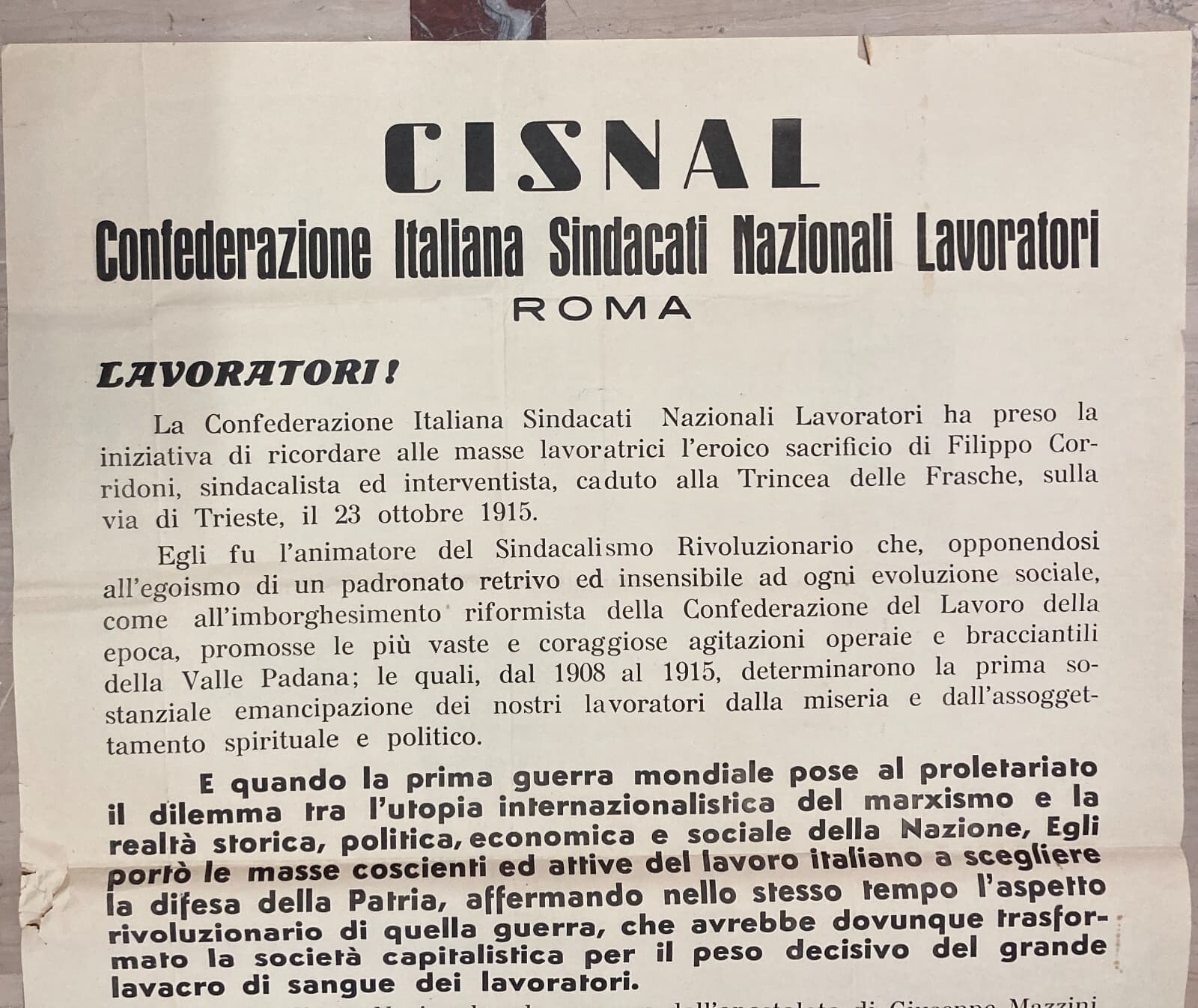 Politica, Economia, Sindacalismo Rivoluzionario: Filippo Corridoni, Manifesto d'Epoca Cisnal