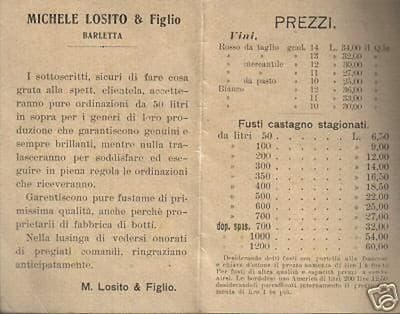 Puglia: Michele Losito & Figli, Barletta. Listino Prezzi Vini E Botti, 1913.