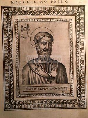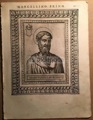 Storia Del Papato: Ritratto Di Pontefice Marcellino I. Incisione Del '500 E Araldica