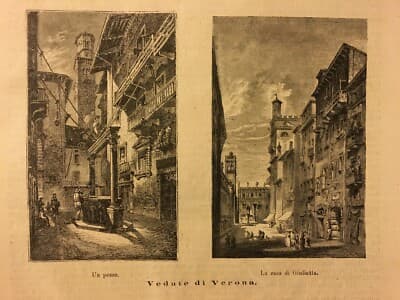 Veneto, Verona: Due Vedute Architettoniche Con Pozzo E Casa Di Giulietta. Antica Stampa Xilografica