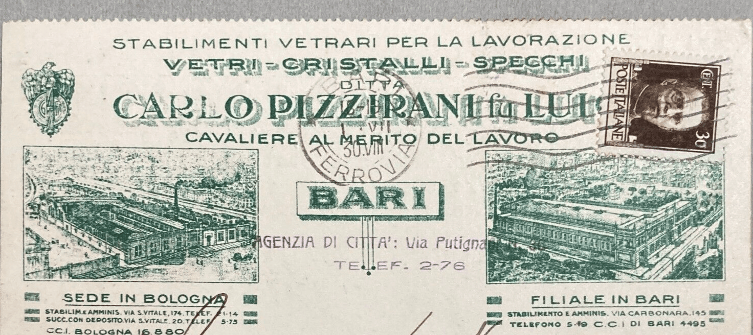 Vetri Vetreria Pizzirani Bologna Bari Cartolina Pubblicitaria Lito Costa 1930