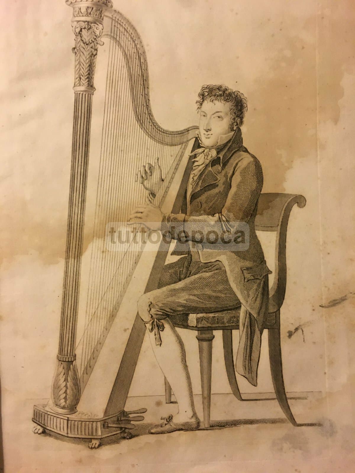 Arpista, Incisione Originale All'Acquaforte Del XIX Secolo