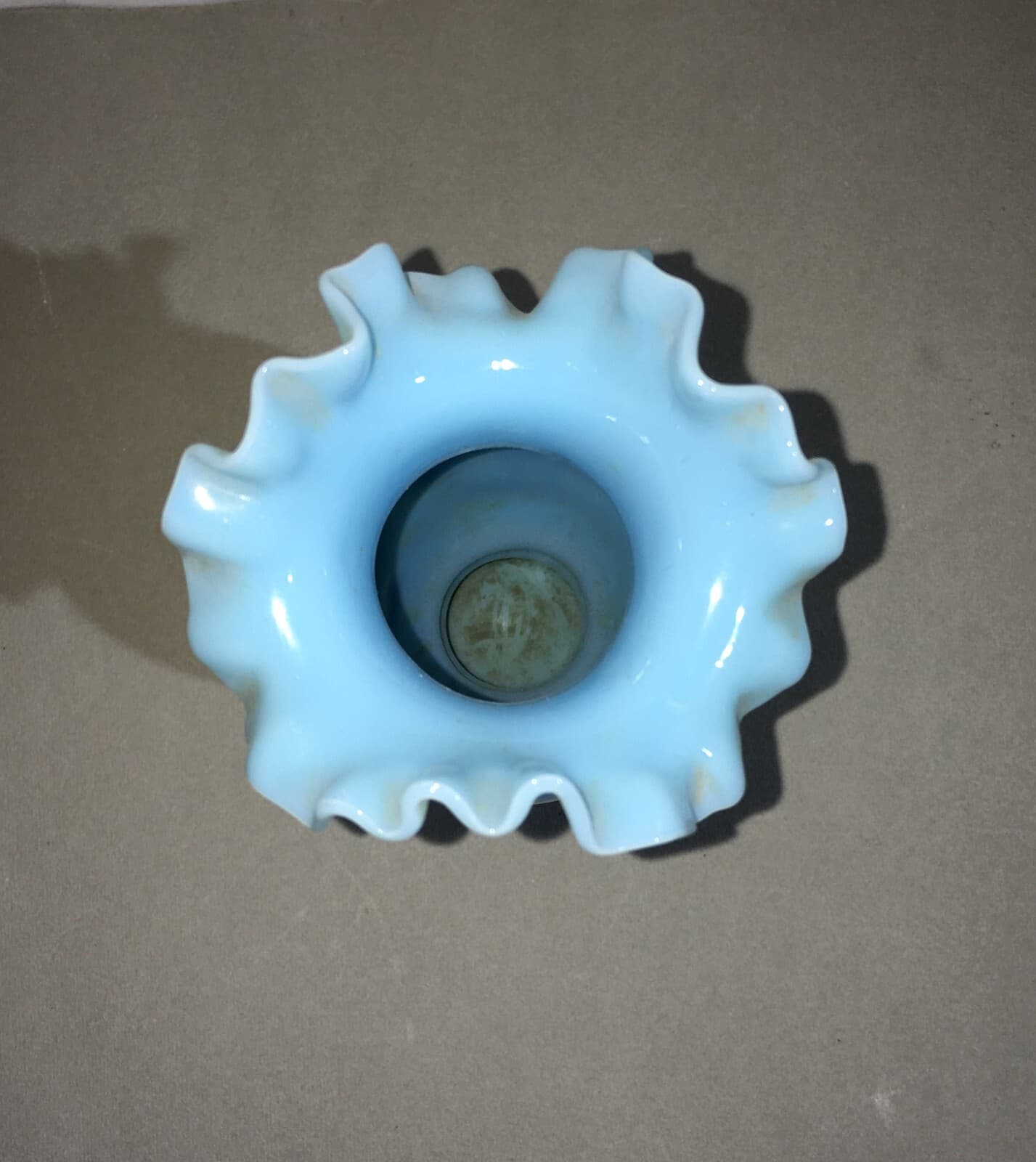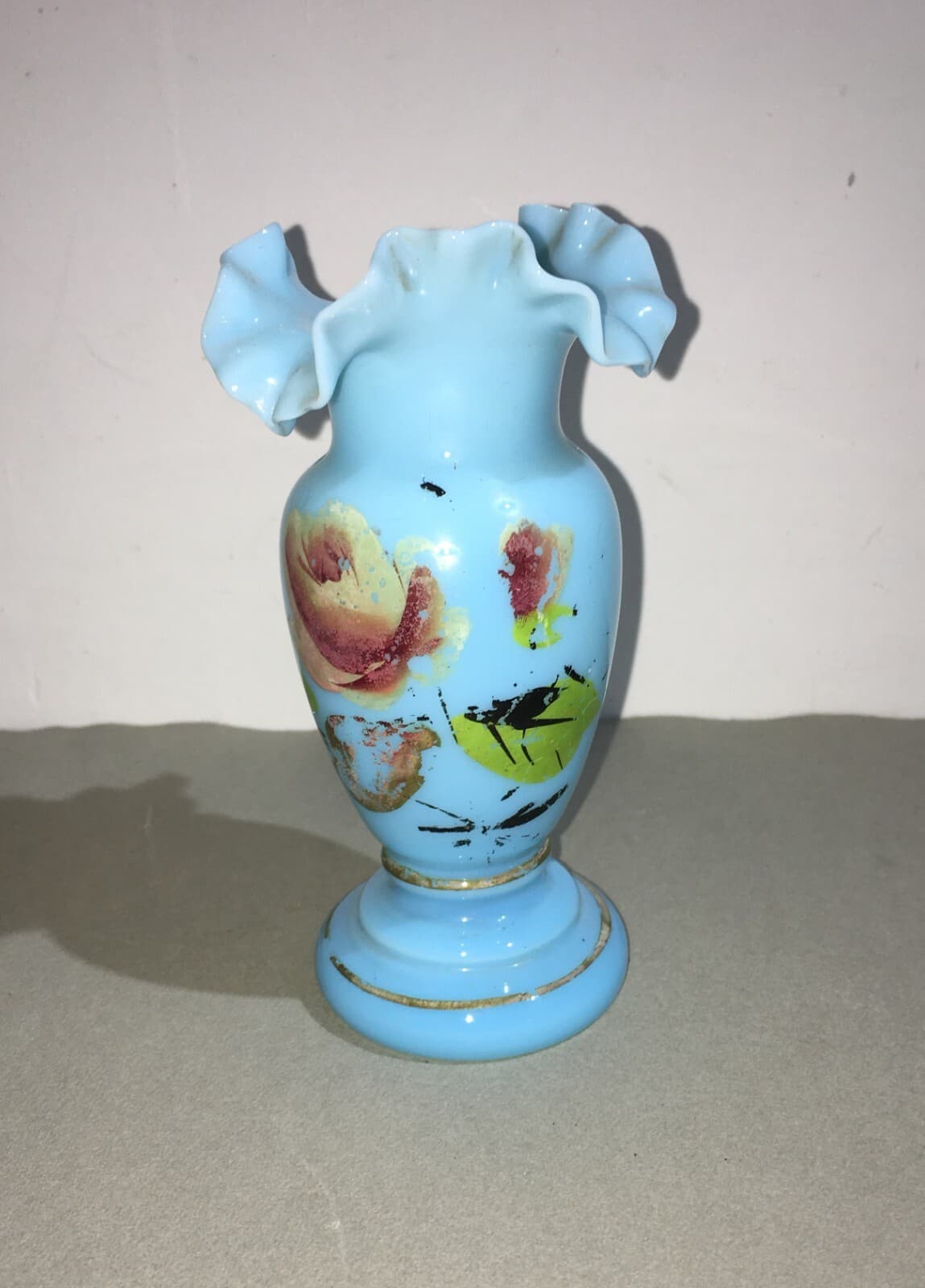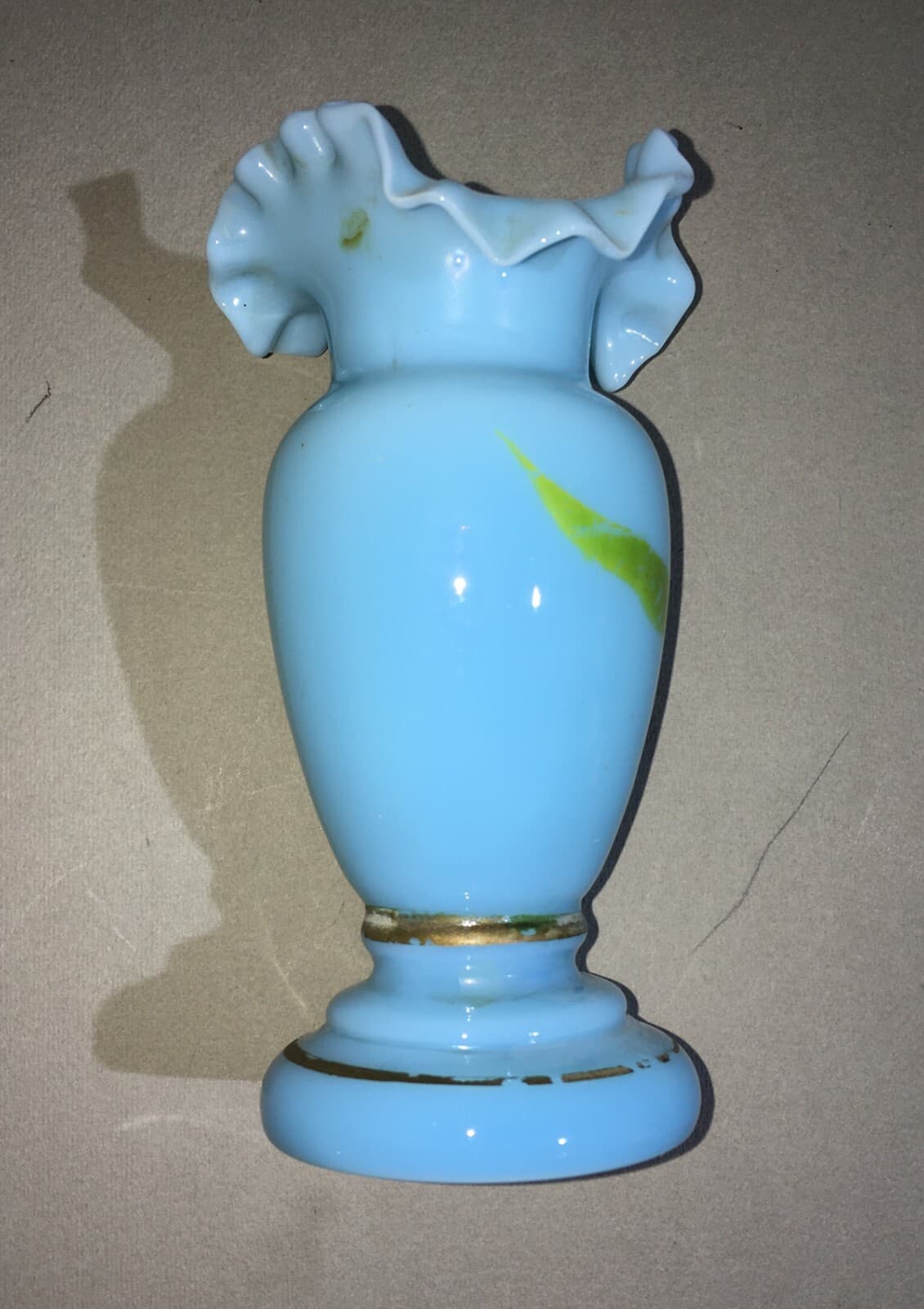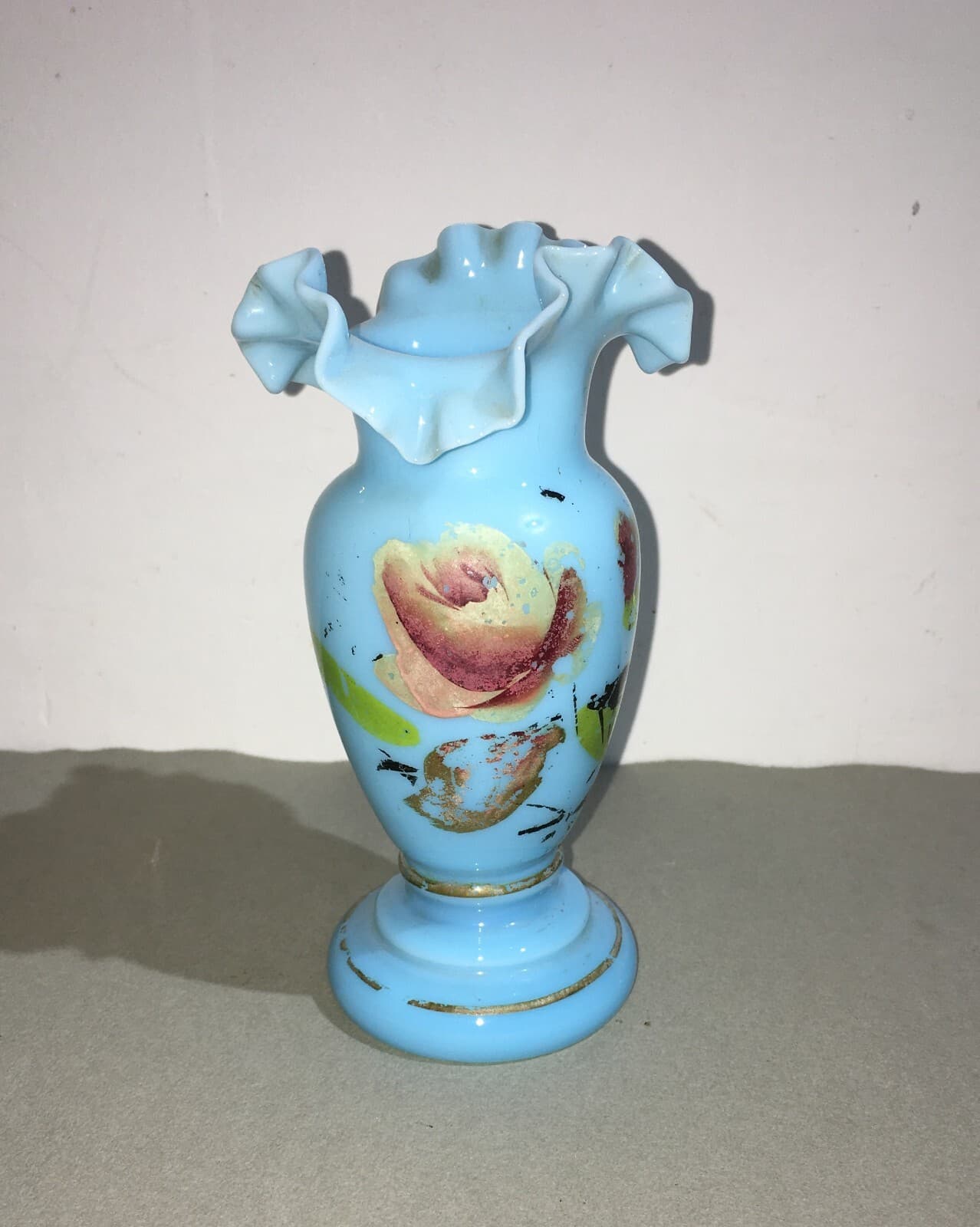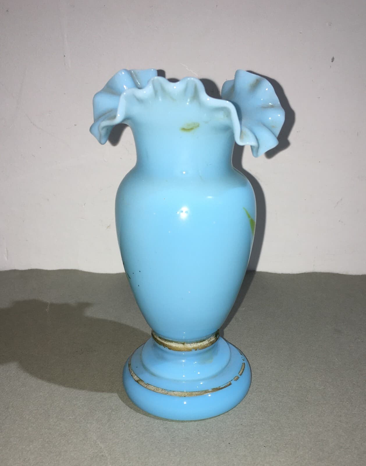 Decorativo Soprammobile Antico: Vasetto Portafiori In Opaline Celeste, Decoro Liberty