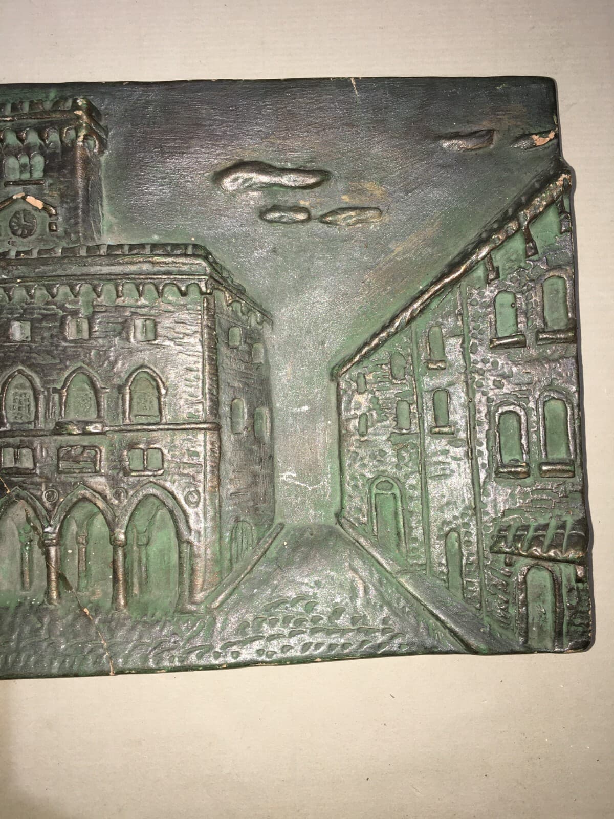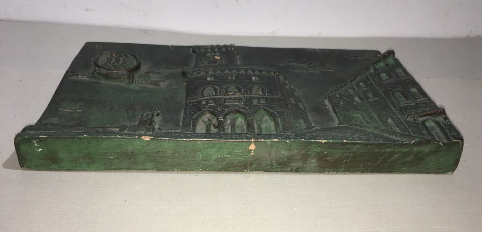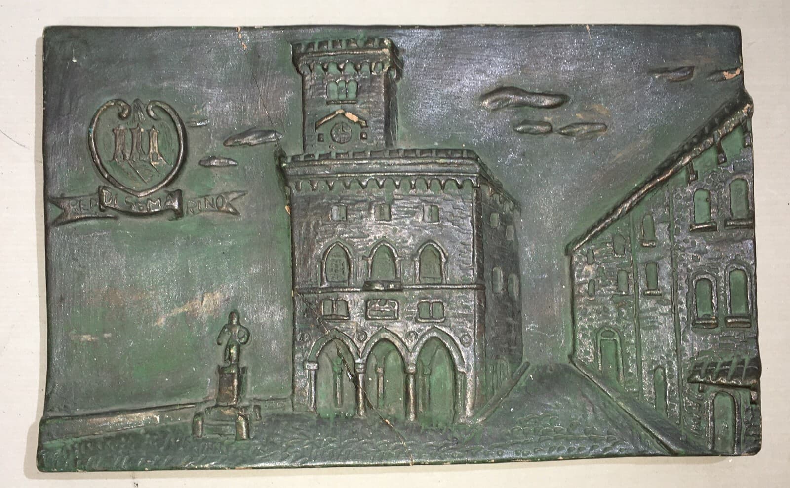 Placca Decorativa In Ceramica Patinata Bronzo, San Marino, Veduta Con Stemma